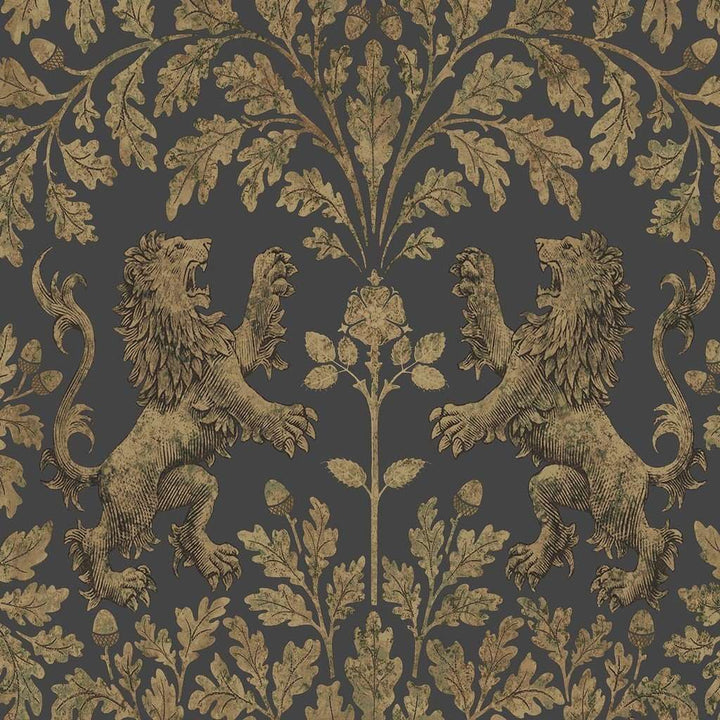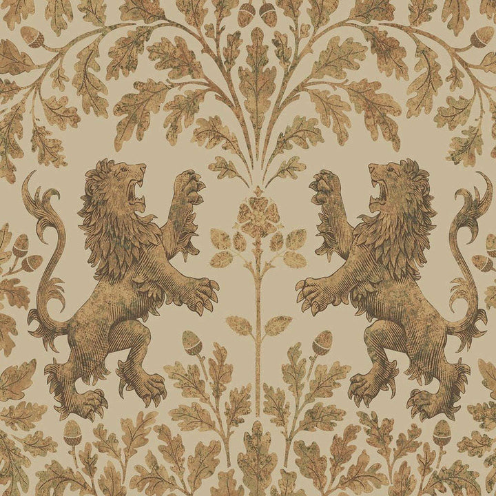 Boscobel Oak behang van Cole & Son. Het luxe behang vol gebladerte en leeuwen wordt gepresenteerd in vergulde paletten die de prachtig verouderde texturen van geoxideerde metalen nabootsen. Gouden tinten sieren dit luxe behang.