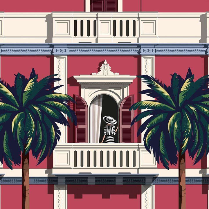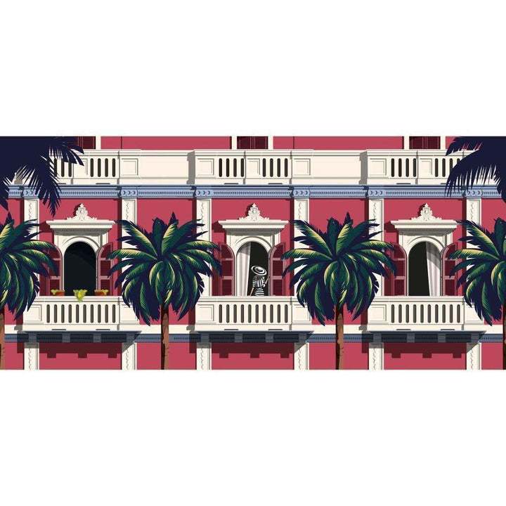 Boulevard behang van Inkiostro Bianco. Dit behang geïnspireerd op de Arcade games doet de 90's herleven! Haal de boulevard in huis met dit kleurrijke behang vol architectuur en palmen.