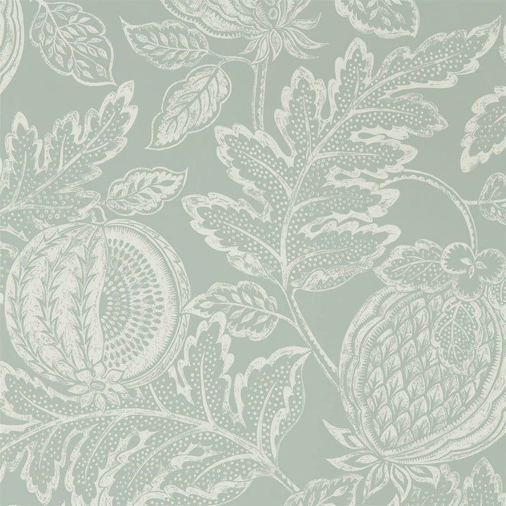 Cantaloupe behang Sanderson. Dit behang is een werkelijk verbluffende weergave van exotisch fruit geïnspireerd door damastinvloeden en botanische tekeningen. Het behang is breed en heeft een prachtige eigentijdse uitstraling. Behang Cantaloupe Sanderson Caspian collectie.