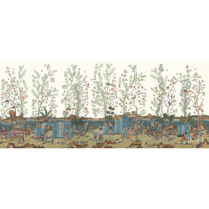 Canton Reverie behang Iksel. Dit is een grillig landschap van het dorpsleven, ontwikkeld vanaf het begin van de 19e eeuw. East India Company Wallpaper. We hebben het onderwerp uitgebreid tot een volledig landschap waarin de eerste en laatste panelen met elkaar zijn verbonden. De originele panelen die ons van antiekhandelaars waren uitgeleend, hadden aan de bovenkant onvolledig gebladerte en panelen die niet bij elkaar kwamen als een continu ontwerp.