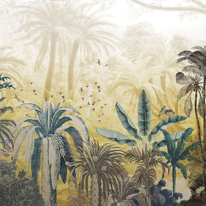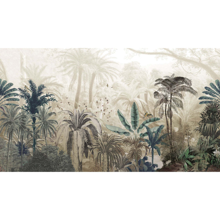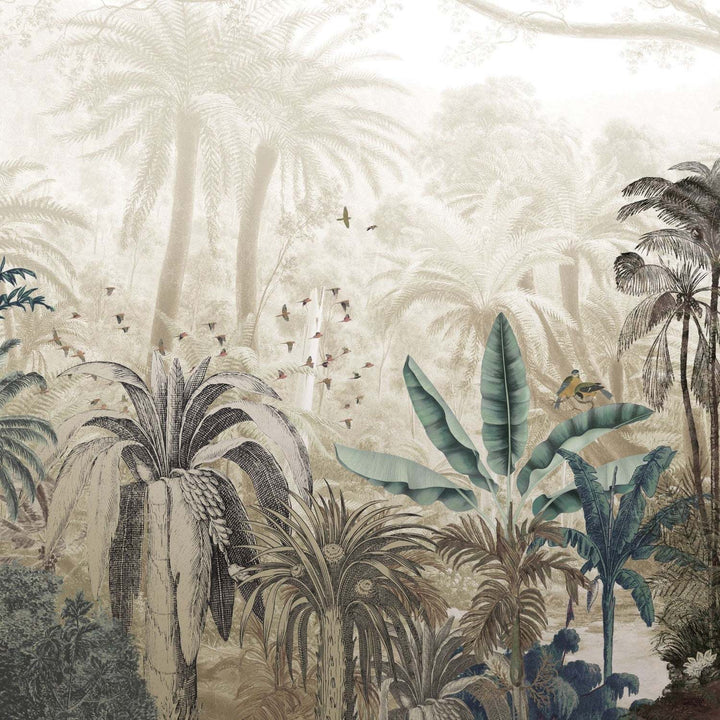 Carlton Gardens behang op maat van Muance. Dit behang is een fantastische panorama! Een tropische jungle wereld vol palmen en bomen met fenomenale diepte.