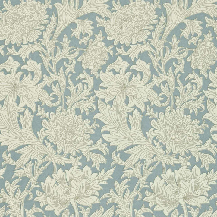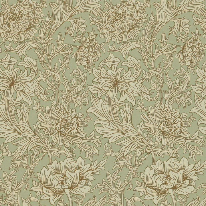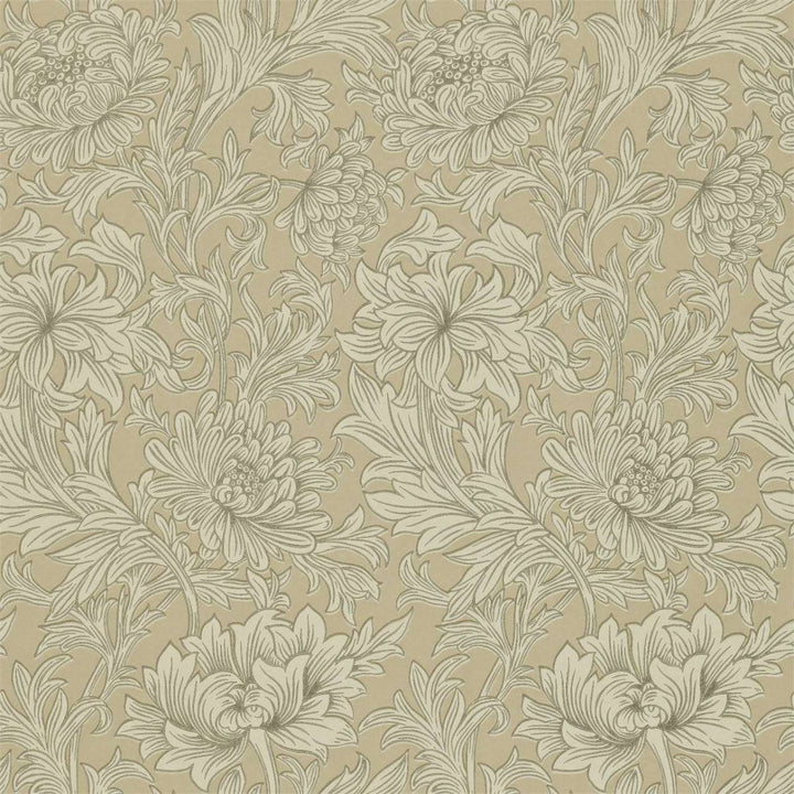 Chrysanthemum Toile behang van Morris & Co. Dit behang is geïnspireerd op de metalen omtrek van het reliëf en vergulde Chrysanthemum behang geproduceerd door Jeffrey & Co. in de jaren 1880. Dit prachtige behang is gemarkeerd in metallic inkt met behulp van de surflex-printmethode.