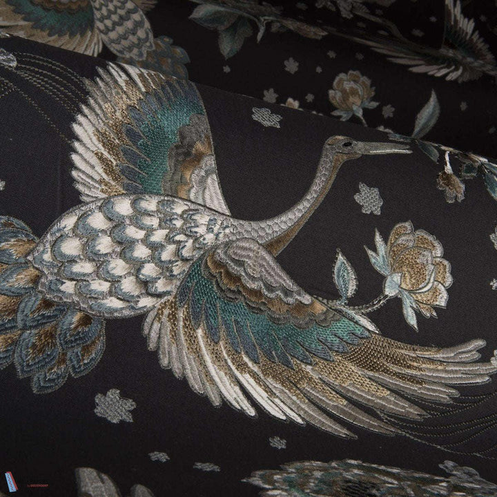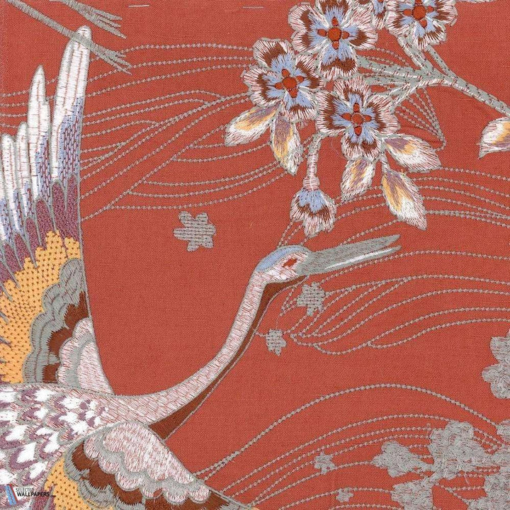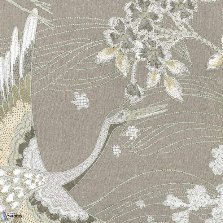 Crane behang van Arte. Het behang heeft een 3d patroon en bestaat uit voorbijvliegende kraanvogels, die in verschillende oosterse landen als echte geluksbrenger gelden. Het behang ontwerp is geborduurd op een stof van katoen en linnen. Het resultaat is een textiel behang vol luxe en rijkdom.