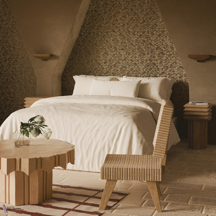 Het Cyperus behang kenmerkt zich door zijn geometrische patroon dat een moderne en tegelijkertijd subtiele uitstraling biedt. De vormen zijn strak en regelmatig, maar de textuur van het natuurlijke gras geeft het ontwerp een organische, aardse schoonheid die de ruimte een zachte en verfijnde sfeer geeft. Het gebruik van gras als basis maakt dit behang niet alleen visueel interessant, maar zorgt ook voor een natuurlijke en verfijnde textuur die in verschillende lichtomstandigheden van nuances verandert.