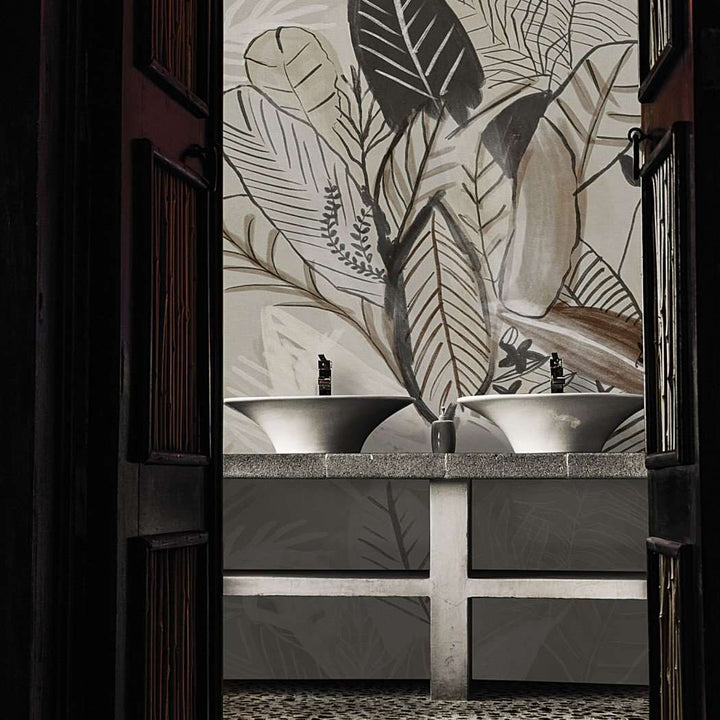 Dea behang van LondonArt. Dit badkamer behang heeft prachtige getekende bladeren. Het geeft een rustige en natuurlijke aanblik.