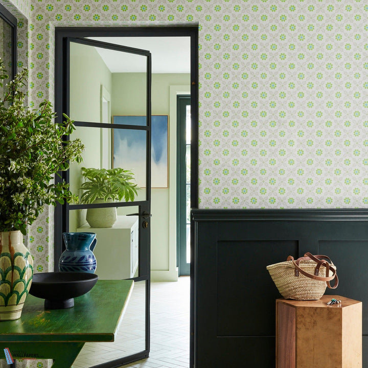 Ditsy Block behang Little Greene. Dit behang toont een elegant bloemenraster. Een sierlijk behang vol geometrie en kleurnuances. Behang Ditsy Block Little Greene behangcollectie National Trust Papers IV.