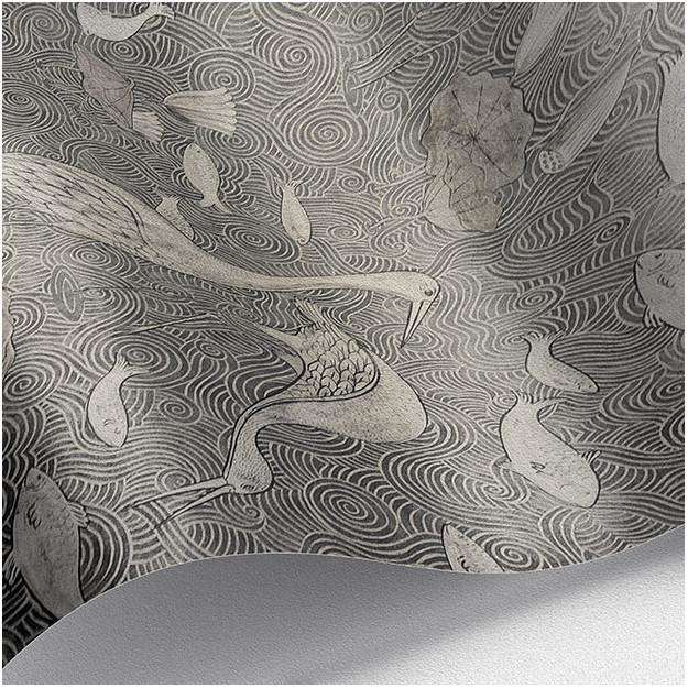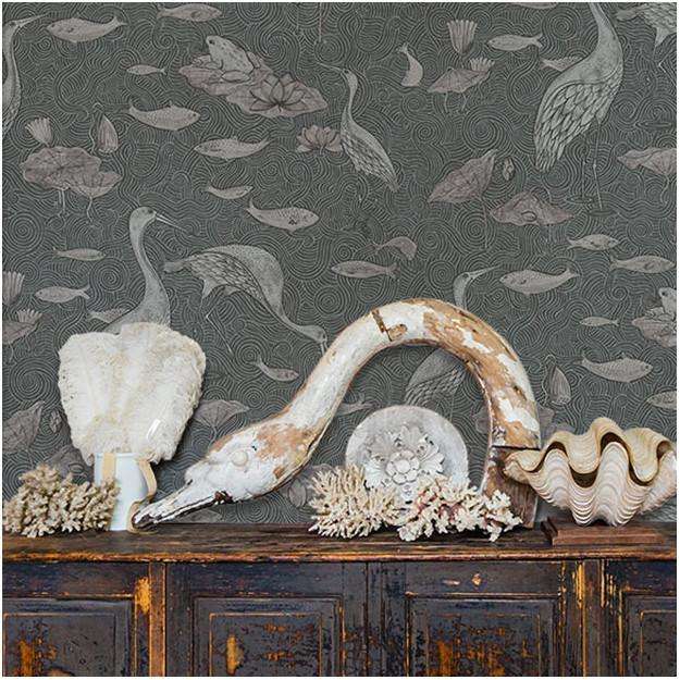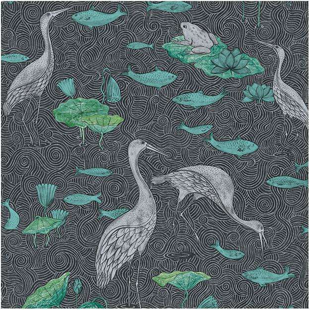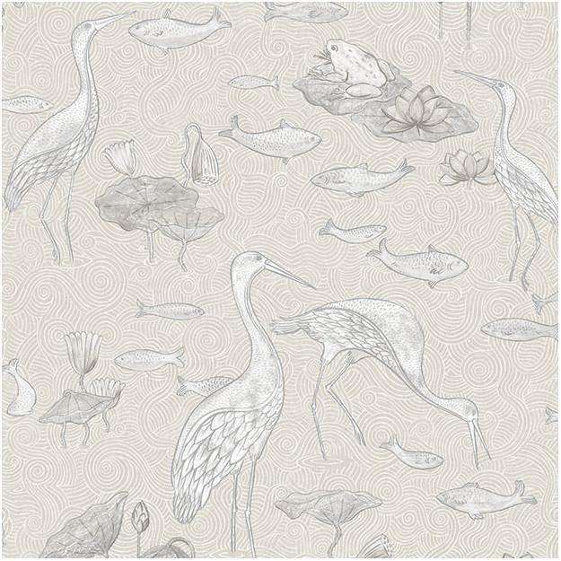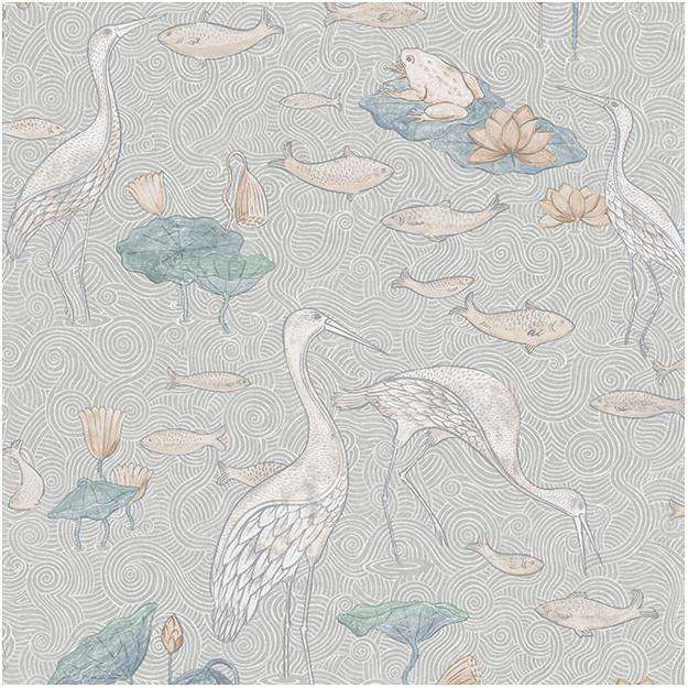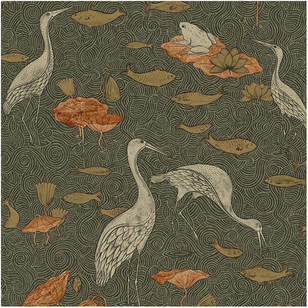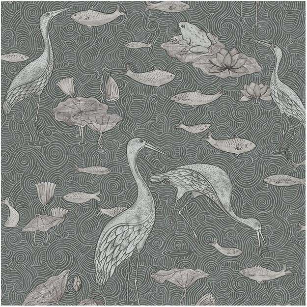 Enchanted River behang van Les Dominotiers. Het behang is op traditionele wijze bedrukt met een vijver, reigers en vissen met gouden en zilveren accenten. Een elegant behang.