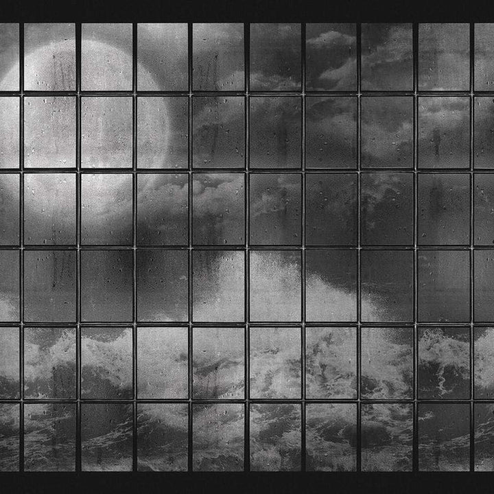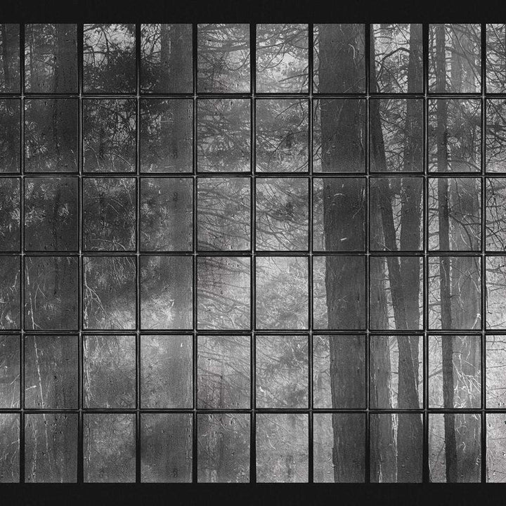 Fenetre behang van LondonArt. Dit badkamer behang is als een kijkje door de kleine ruitjes waarachter zich een verhaal afspeelt. Een kijkje in de bossen, op zee en in de jungle.