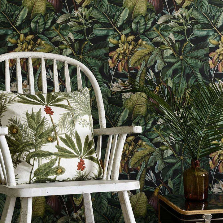 Exotic Garden behang van Mind the Gap. Dit behang is botanisch en geïnspireerd op enkele heerlijke vruchten die in tropische gebied te vinden zijn. Vijgen en dadels aan prachtige bomen!