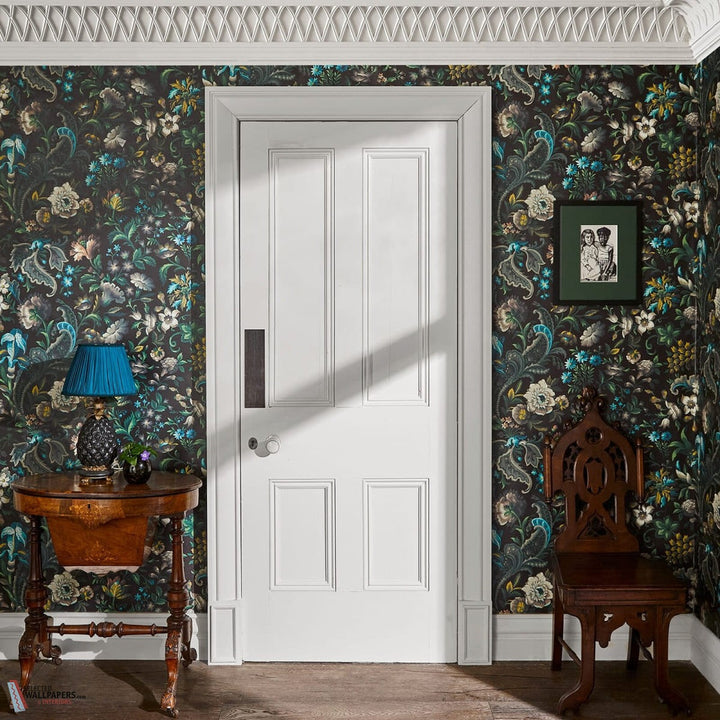 Florika behang House of Hackney. Dit behang toont een herinterpretatie van een klassieke paisley print. Levendige amethist en juweelkleurige highlights zorgen voor een betoverend ontwerp met bloemen. Petrol en Zwart. Behang Florika House of Hackney