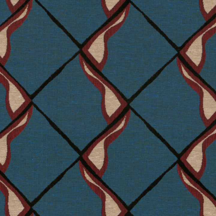 Fresca stof Mind The Gap. De stof Fresca is een blauwe stof met gekronkelde lijnen die sierlijk hun weg banen door de zwarte vierkanten heen. Het patroon is opvallend door de combinatie van verschillende vormen dicht bij elkaar. Stof Fresca Mind The Gap.