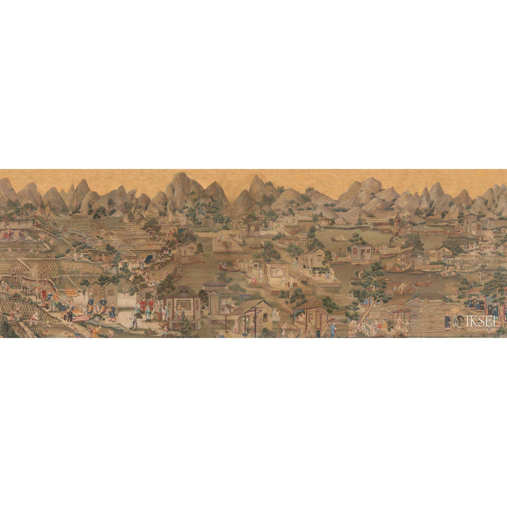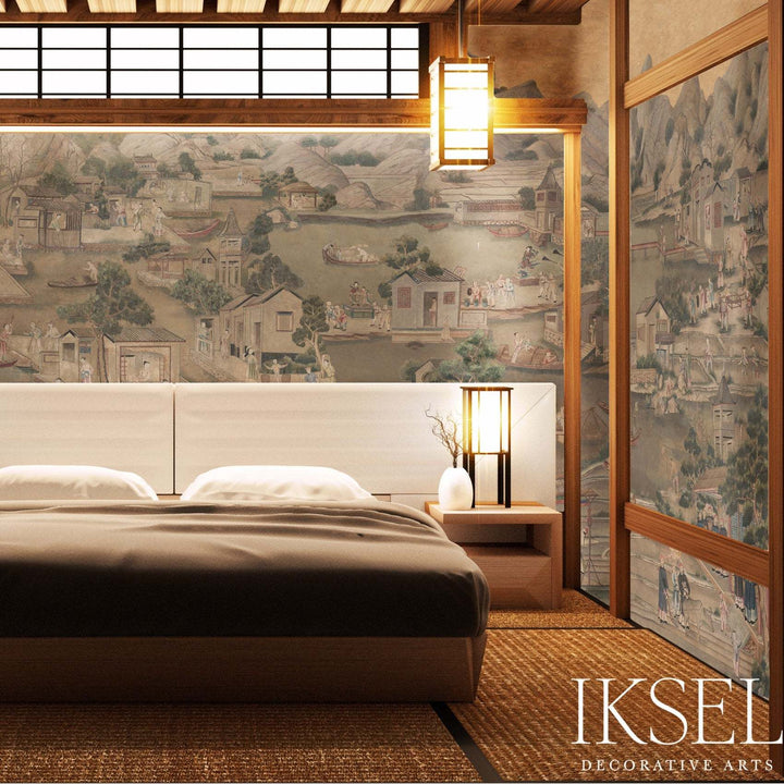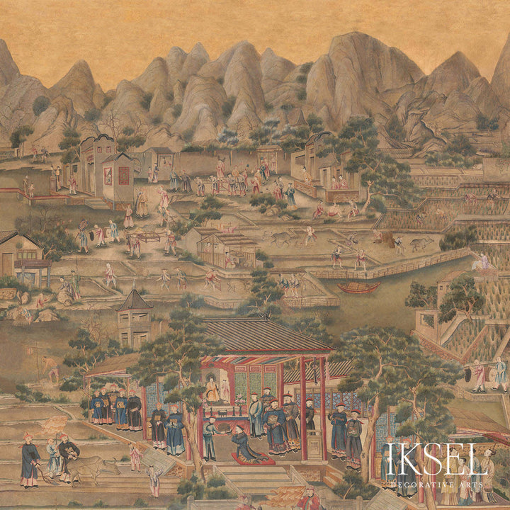 Governor's Visit behang Iksel. Dit behang toont een gouverneursbezoek en is gemaakt van een origineel behang van de East India Company dat omstreeks 1770 in China is geschilderd. Iksel's versie van dit decor vertegenwoordigt een enorme hoeveelheid werk in restauratie. Ontbrekende onderdelen zijn opnieuw gedaan en de schade is hersteld, dus het behang heeft een frisheid waardoor het beter is dan het origineel.