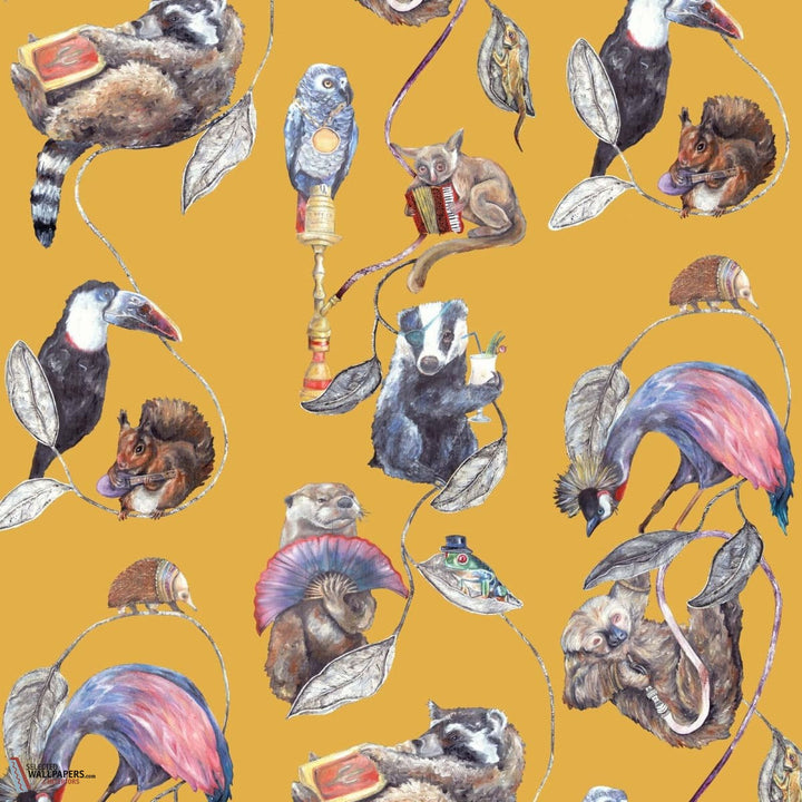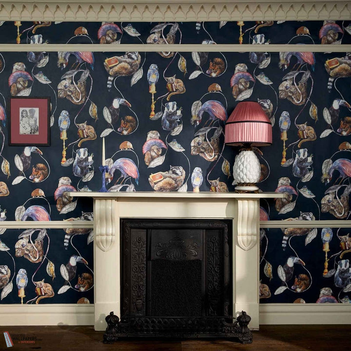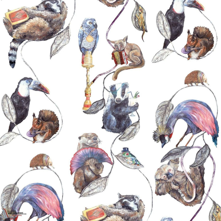 Hackney Empire behang House of Hackney. Dit behang toont dieren die in pracht en praal gekleed zijn. Een iconische print met waterpijp rokende luiaard, een kikker met bolhoed en nog veel meer karakteristieke wezens. Behang Hackney Empire House of Hackney