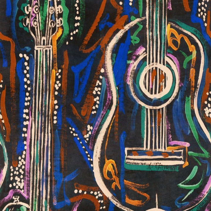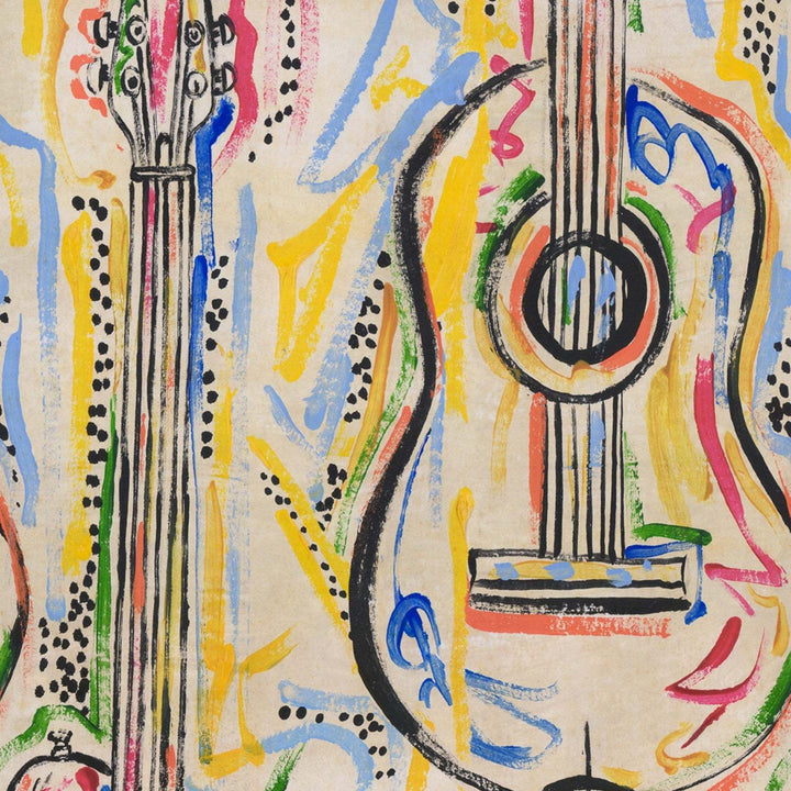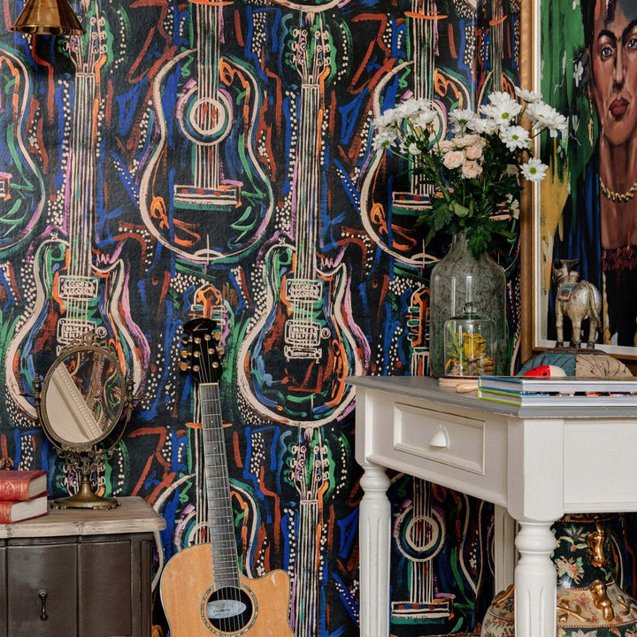 Harmony behang van Mind the Gap. Dit behang draait om de magie van het instrument, de gitaar en elektrische gitaar die in abstracte lijnen en dromerige sfeer creëren. Behang Harmony Mind the Gap Woodstock Lifestyle Collection.
