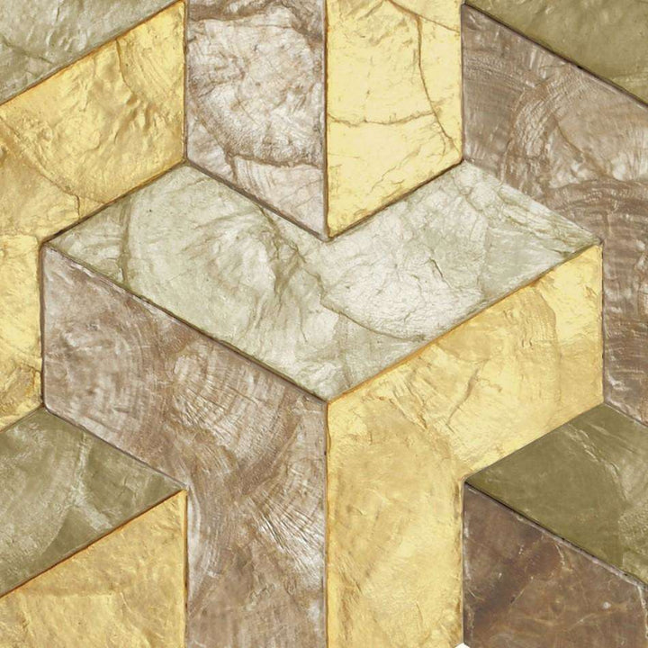 Helix behang van Arte. Dit behang is gemaakt van echte schelpen. De schelpen zijn op een geometrische wijze op patroon gelegd, waardoor er een 3d illusie ontstaat. De kleur nuances van het parelmoer variëren naargelang de lichtinval en geven een fanatische luxe uitstraling.