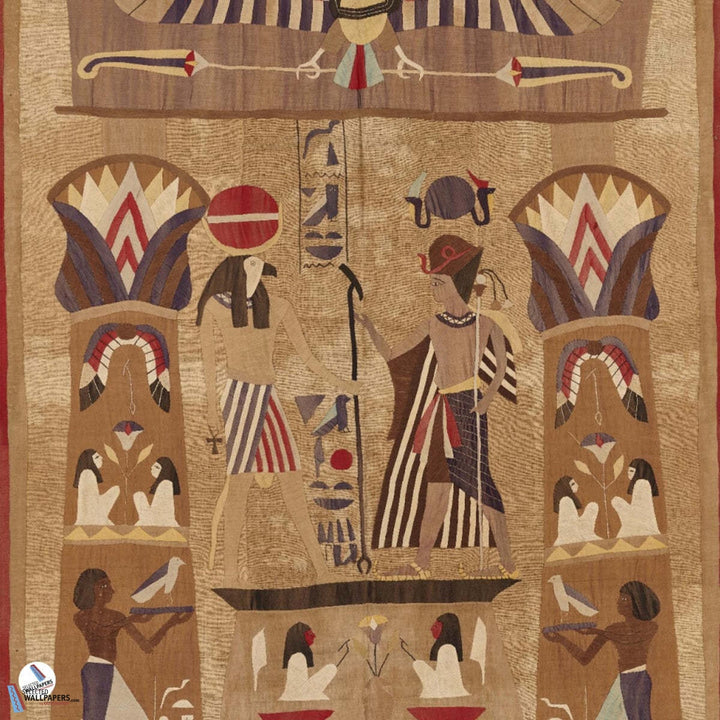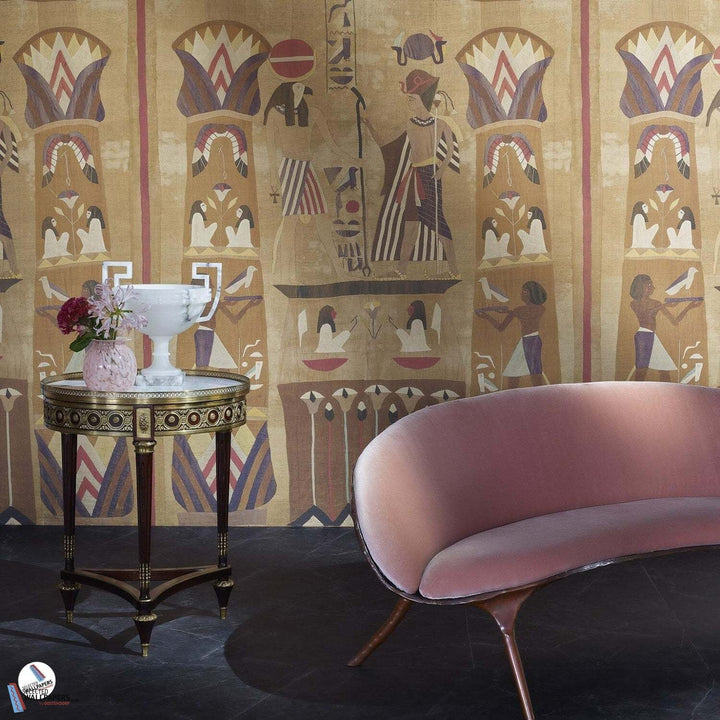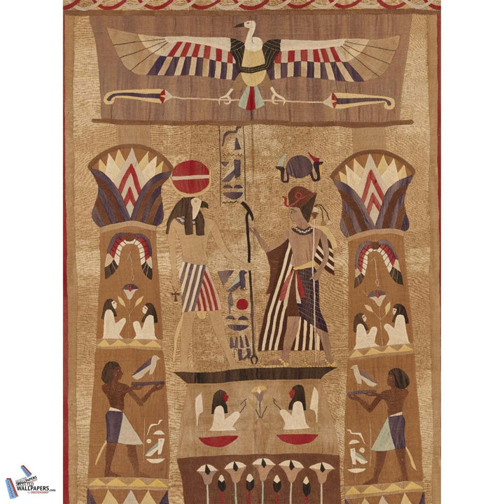 Horus behang van Pierre Frey. Dit behang uit het archief dateert uit de jaren 1920 en bevat geborduurde applicaties. Symbolisch voor Egyptische decoraties. Gedrukt op een linnen een prachtig behang. Behang Horus uit de Merveilles D'Egypte collectie van Pierre Frey.
