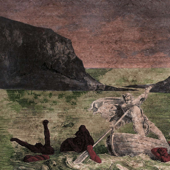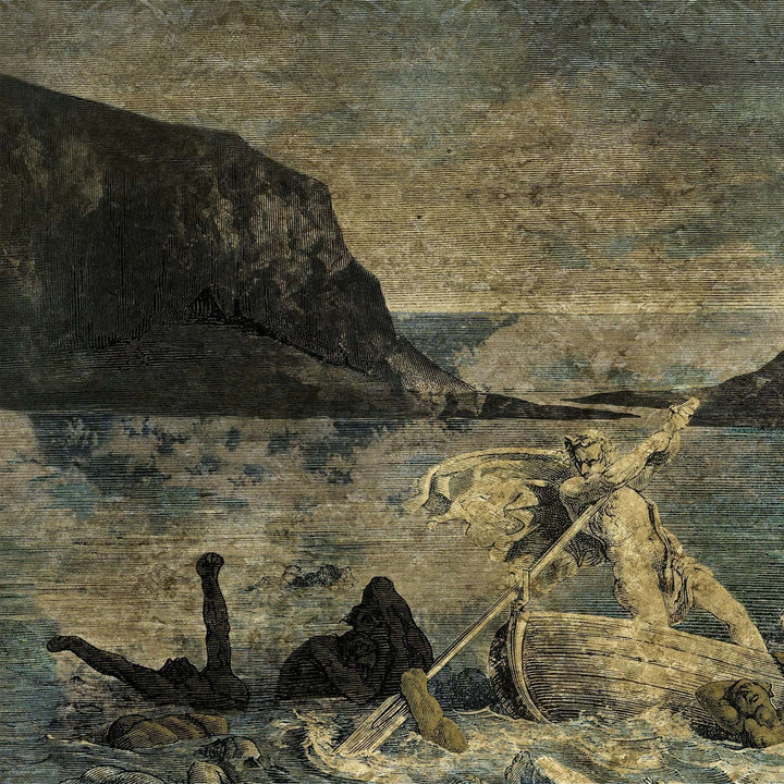 Inferius behang op maat van Inkiostro Bianco. Een mural met een panorama dat zich afspeelt op zee. Dit behang wordt op maat gemaakt en heeft een goud of goud/roze afwerking, het resulteert in een behang vol luxe.