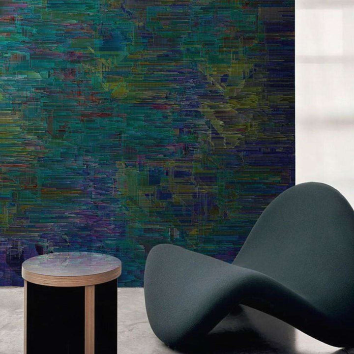 Interference behang van LondonArt wallpaper. Dit behang is voortgekomen uit technologisch onderzoek. Een patroon dat doet denken aan de textuur van een met de hand geverfde zijden stof. Door digitale manipulatie van de afbeelding is dit ontwerp tot stand gekomen.