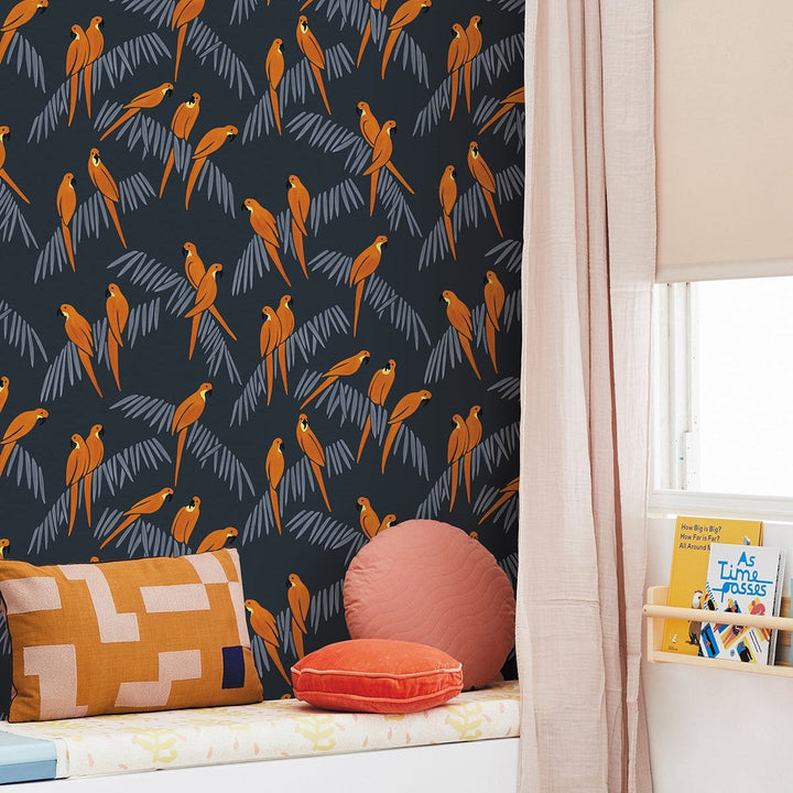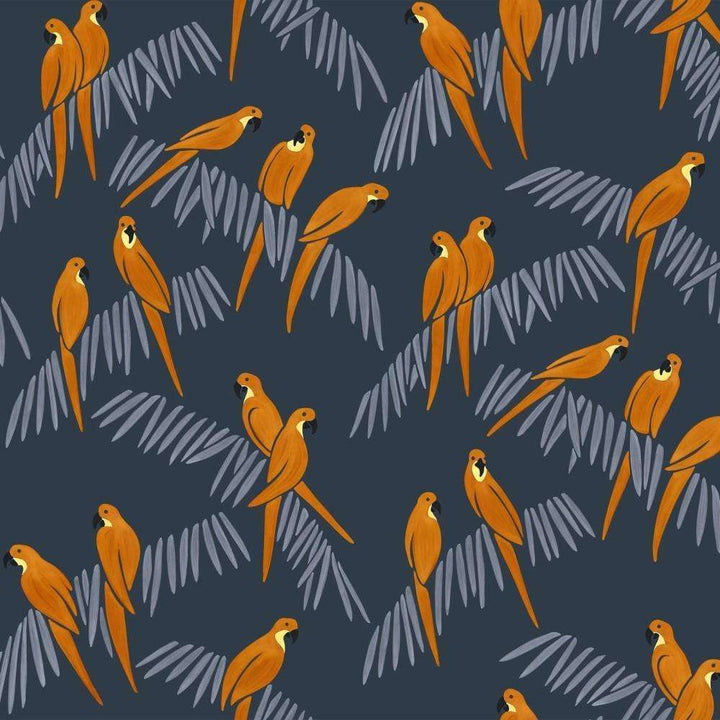 Jaco behang van Isidore Leroy. Dit behang wordt je gelijk vrolijk van. Vriendelijke papegaaien op takken verspreid over het behang. Verkrijgbaar in een donkere en lichte versie.