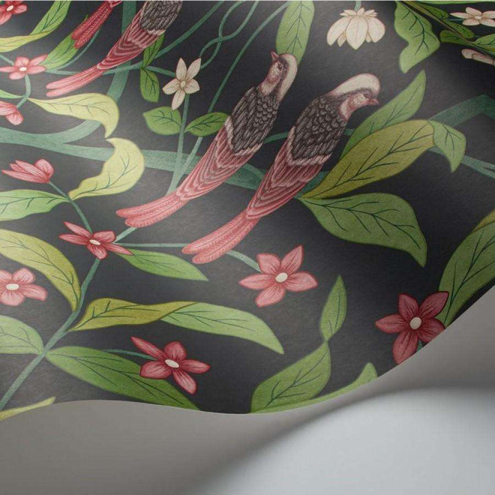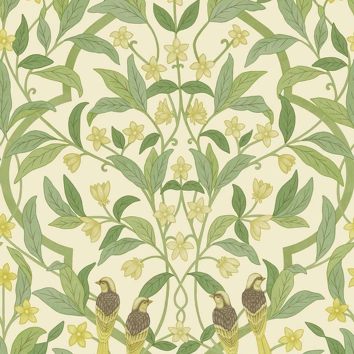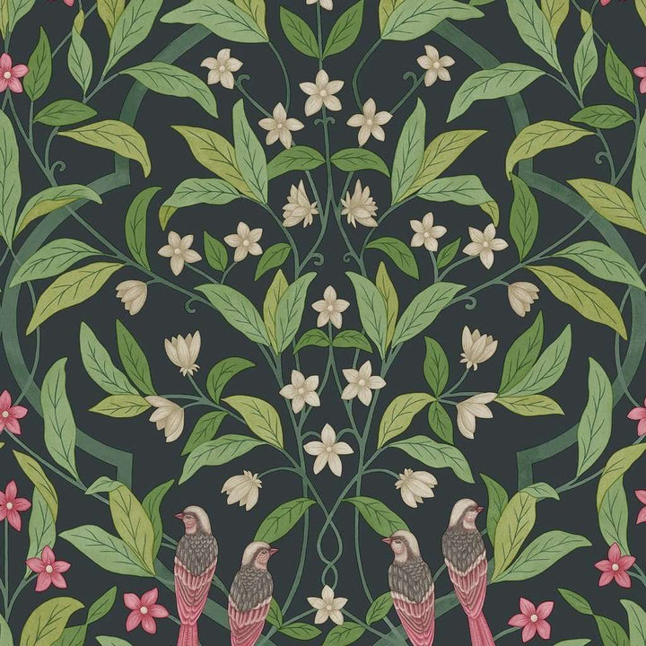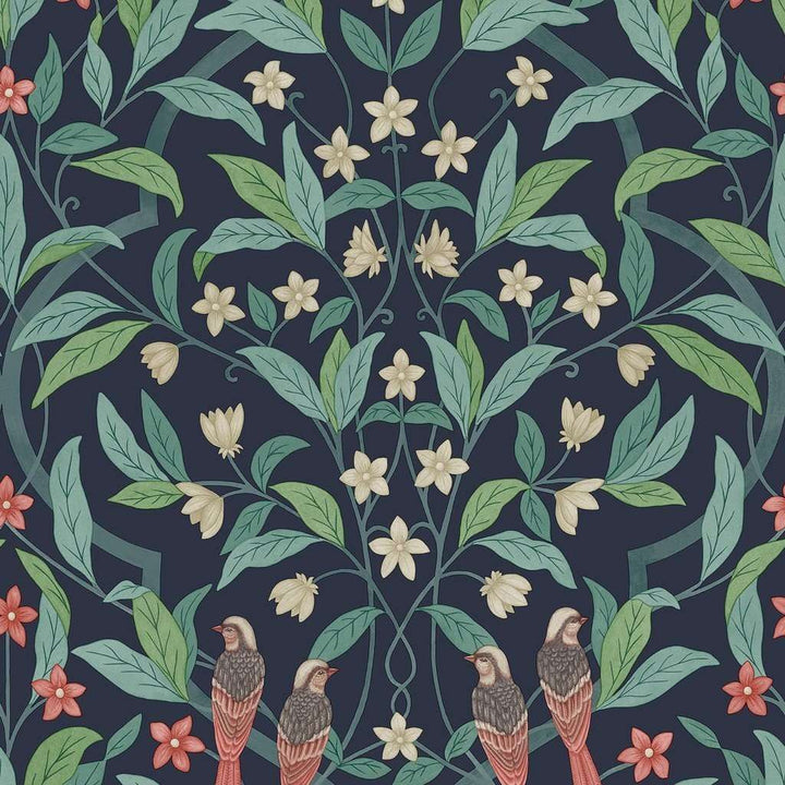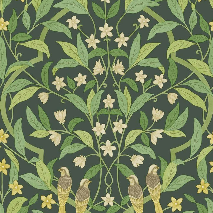 Jasmine & Serin Symphony behang van Cole & Son. Dit behang zit vol vogels die tussen de achterblijvende jasmijnwijnstokken zitten, de flora en fauna creëren een natuurlijke sfeer.