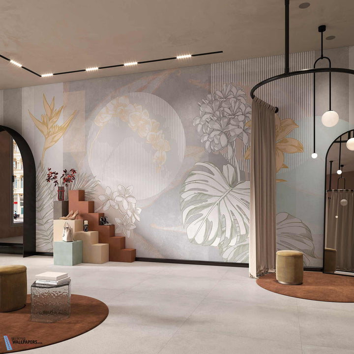 Kauai Flowers behang Tecnografica. Dit behang op maat toont een combinatie van organische vormen en botanische prints. Een ontwerp in zachte kalme kleuren. Behang Kauai Flowers Tecnografica.