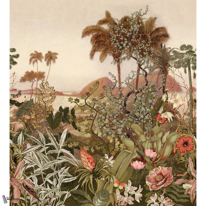 Het Kisama behang uit de Panoramas 4 collectie van Casamance brengt de betovering van de Kisama-regio in Angola direct naar je interieur. Dit ontwerp is een visuele ode aan de uitzonderlijke biodiversiteit van de regio, die bekendstaat om zijn weelderige tuinen en kleurrijke flora en fauna. Het vinyl Kisama behang vangt de levendige kleuren van de tropen en brengt ze samen in een harmonie van bloemen, vogels en vlinders die de lucht vullen. Wijnstokken slingeren omhoog langs palmbomen, terwijl hibiscus, schelpengember en orchideeën op een vinyl ondergrond zich met elkaar vermengen en een adembenemend beeld vormen van de natuur in haar volle pracht.