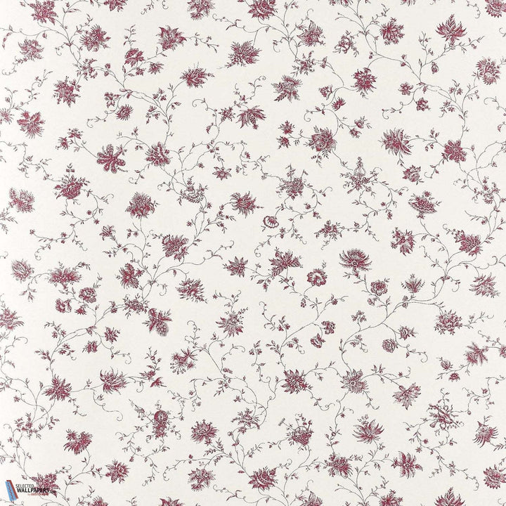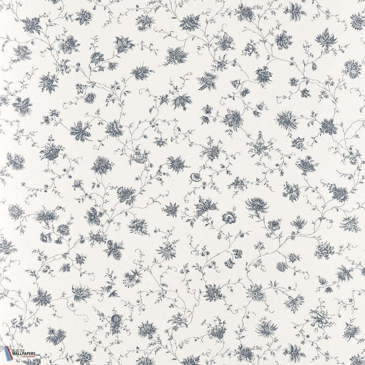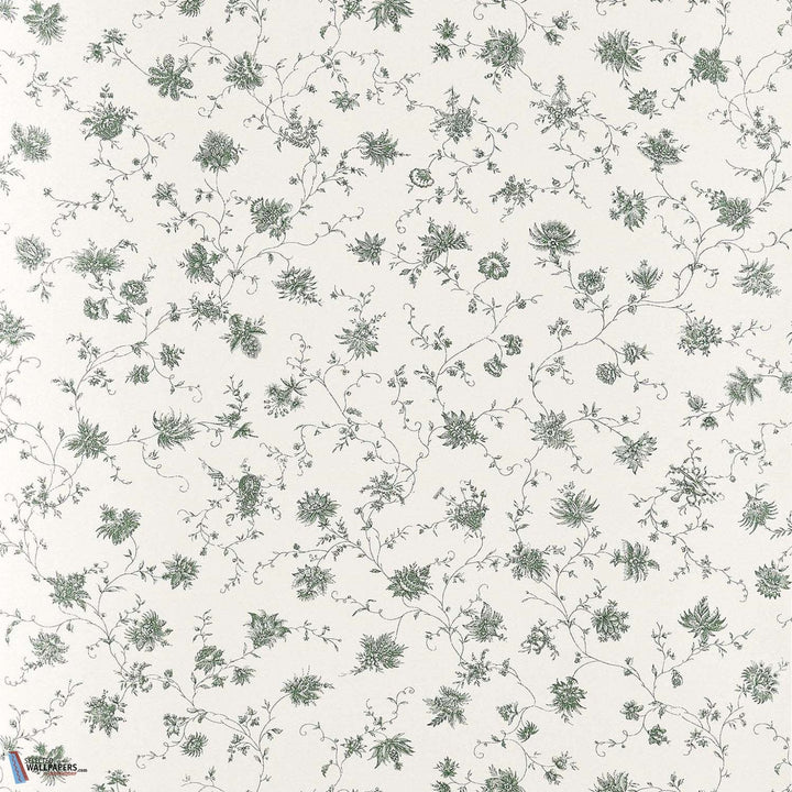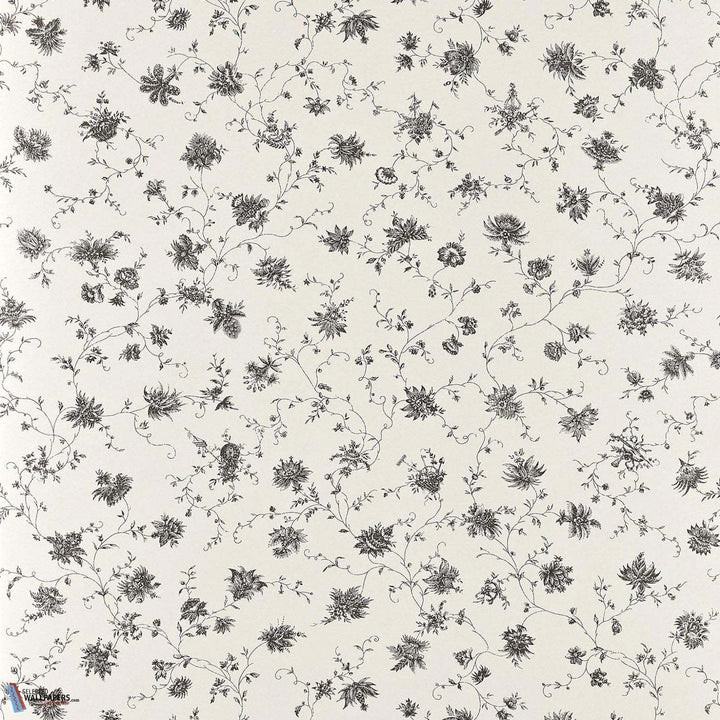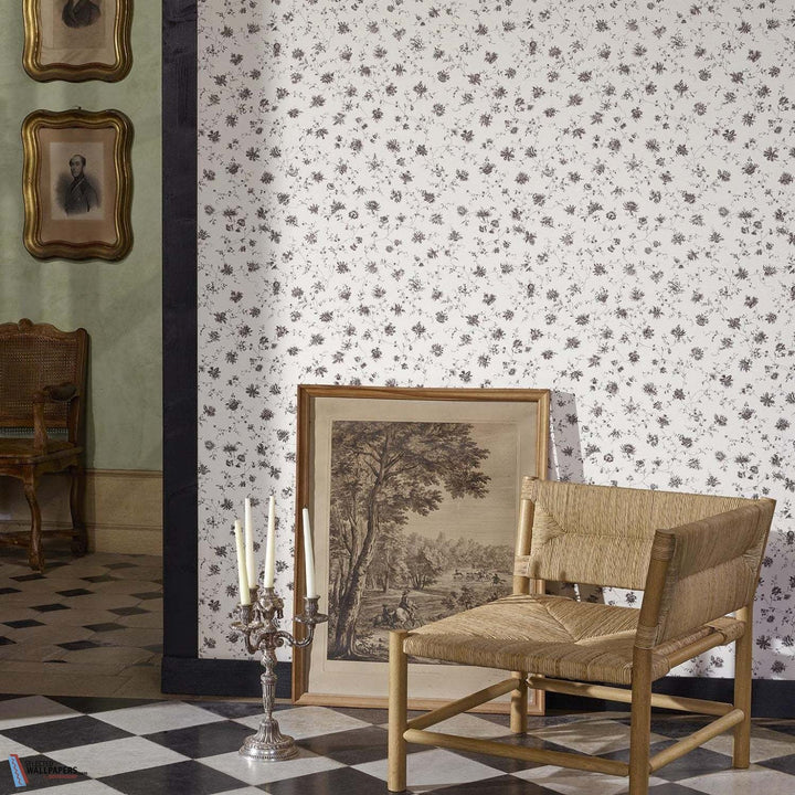 La Discrete behang Braquenie. Dit behang heeft een delicaat patroon van monochrome bloemen met landelijke taferelen. Een ontwerp uit het archief van rond 1775. Behang La Discrete Braquenie by Pierre Frey Collection Anniversaire 1823.