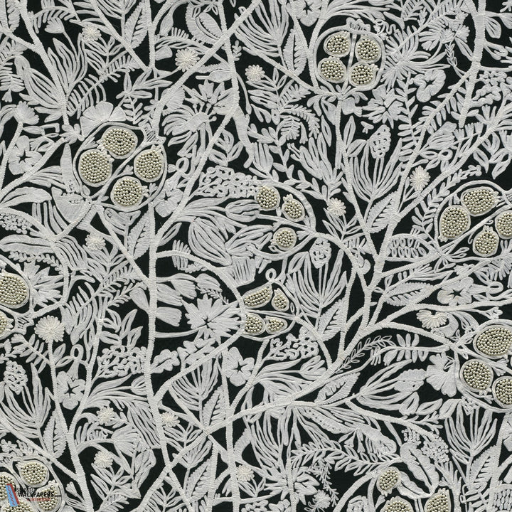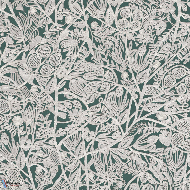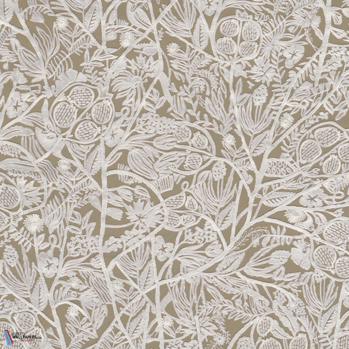 La Perle behang Arte. Dit behang toont een bijzonder fijn borduurwerk met een klassieke floraal patroon vol bloemen en bladeren. Behang La PerleArte Le Couturier behangcollectie.