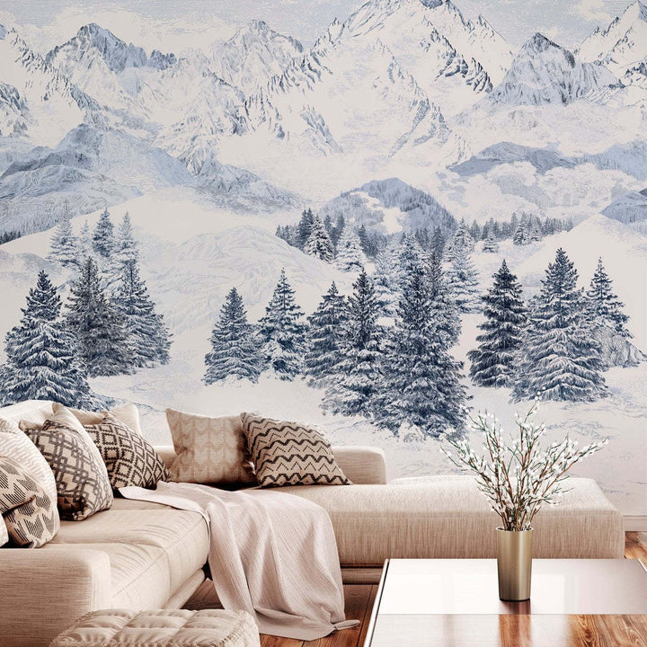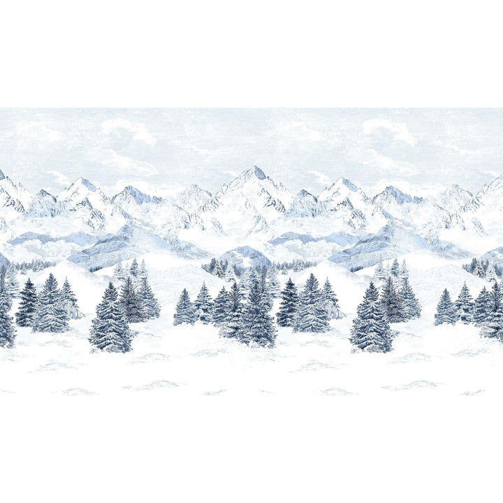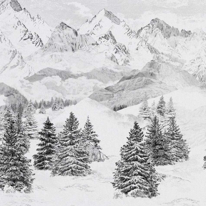 Les Cimes behang van Isidore Leroy. Dit behang is een prachtig winters landschap van de alpen. Natuurlijk door zijn bergen en dennen, rustgevend en sfeervol.