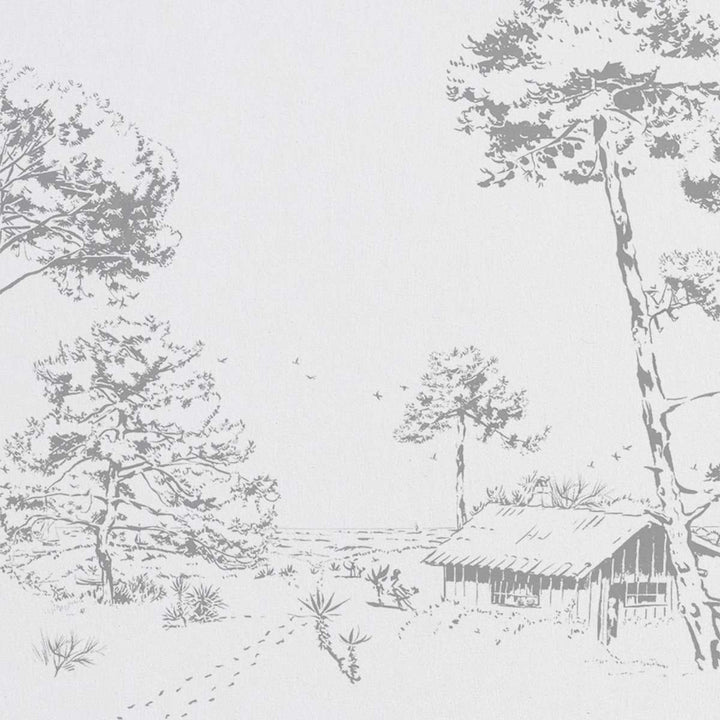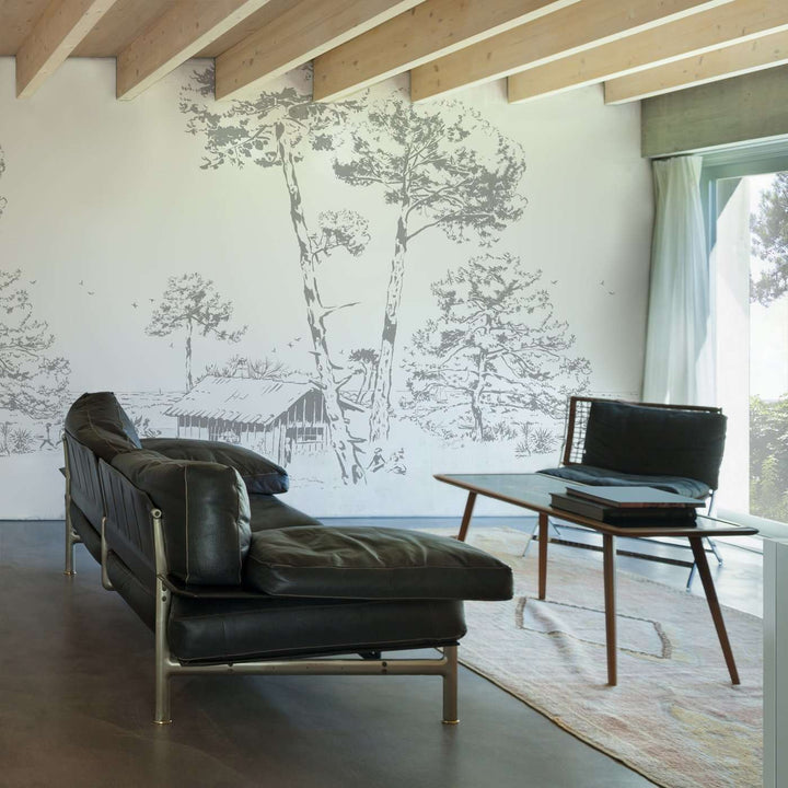 Les Pins behang van Isidore Leroy. Dit behang is een minimalistisch landschap en komt voort uit een passie voor inkttekeningen. Een prachtig wanddecor op maat.