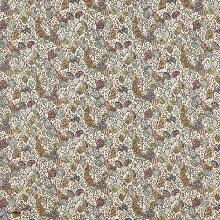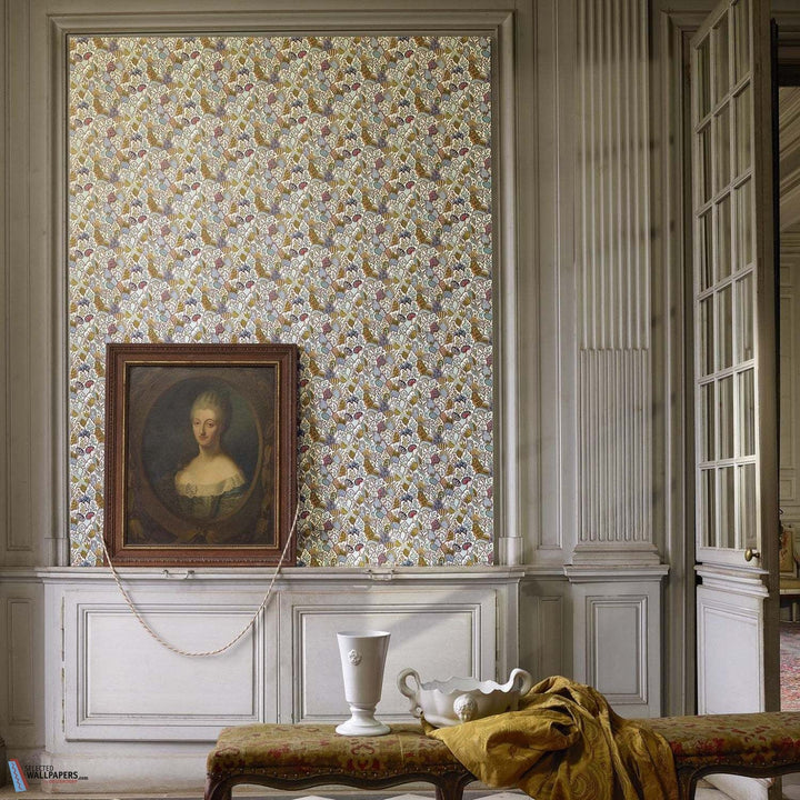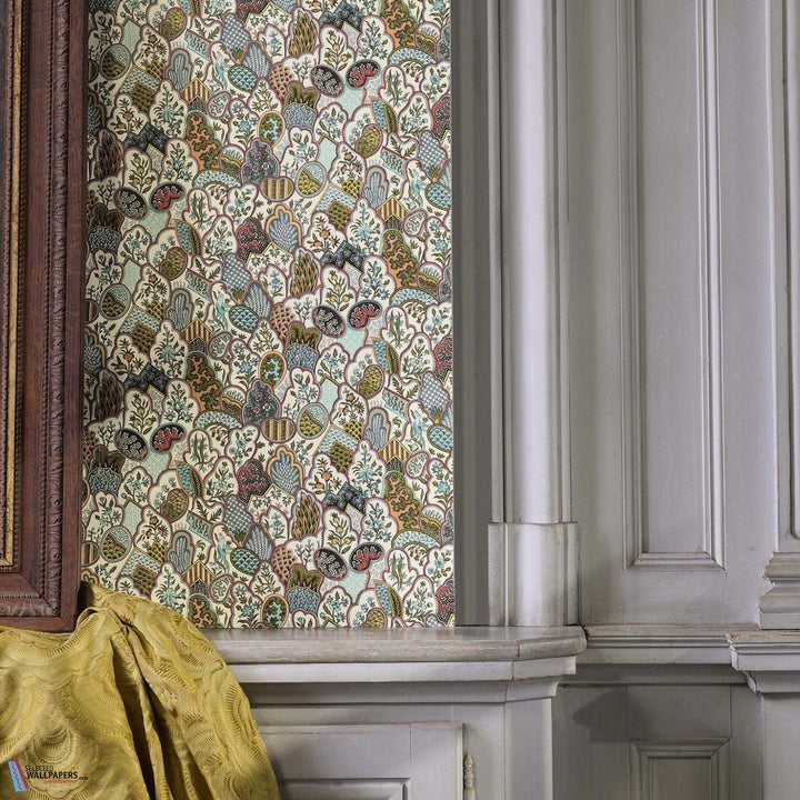 Les Rivieres de L'Indus behang Braquenie. Dit behang zit vol decoratieve elementen, een motief bekend als een Chinees overlappend patroon. Behang Les Rivieres de L'Indus Braquenie by Pierre Frey Collection Anniversaire 1823.