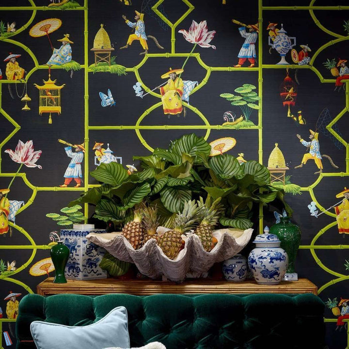 Les singes savants behang van Pierre Frey. Het behang heeft een chinoiserie van een fantasiewereld. Een handgeschilderd ontwerp gedrukt op vinyl met een zijde effect. Oosterse uitstraling met vrolijke apen.