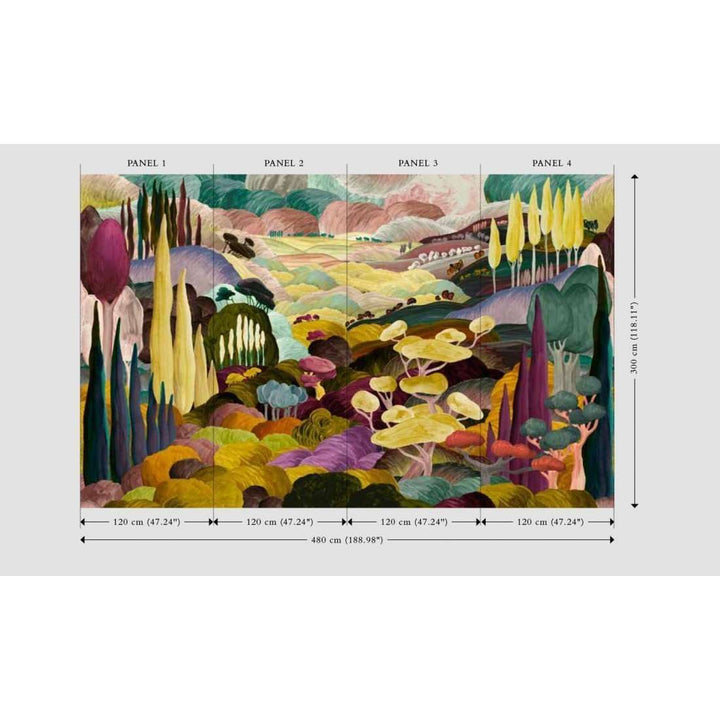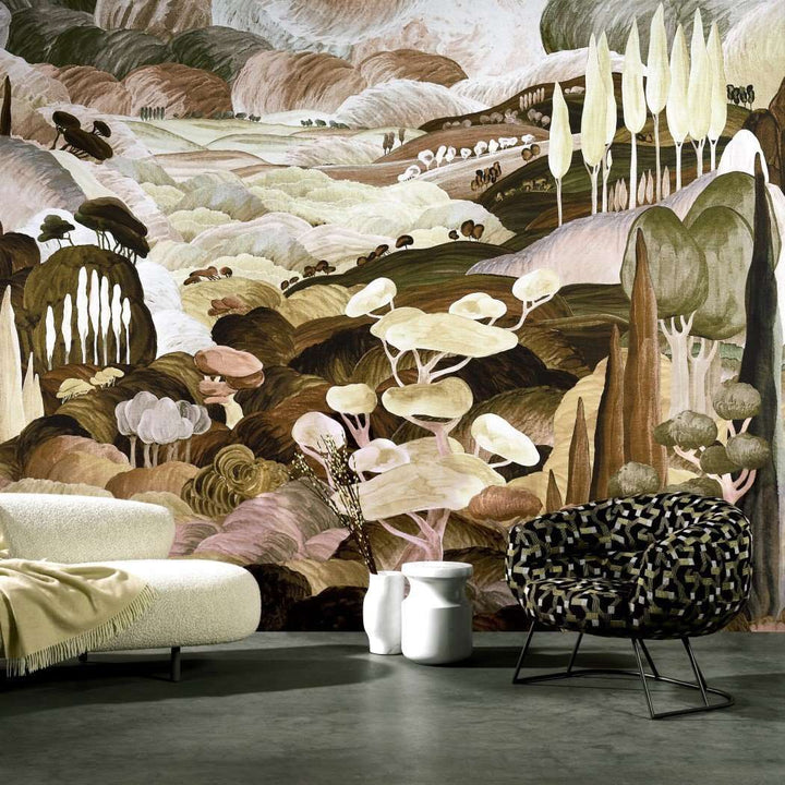 Les Songes Toscans behang van Arte. Dit decor behang toont een Toscaans landschap in een fantasiewereld. Prachtige zachte vormen die symbool staan voor de Italiaanse natuur.
