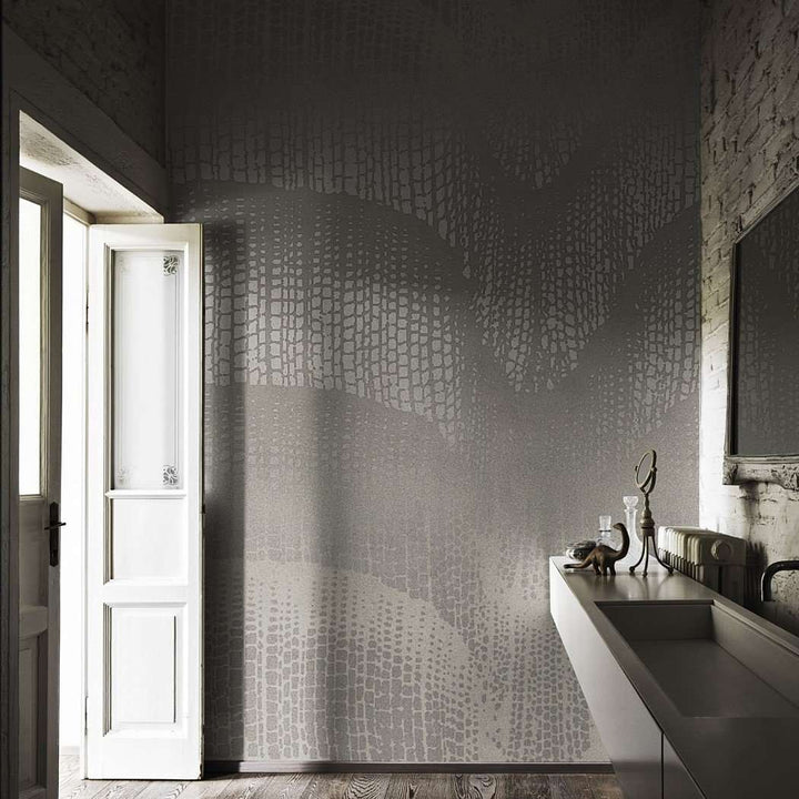 Linfa behang van LondonArt. Dit badkamer behang in beton kleuren heeft een natuurlijke en rustgevende uitstraling.
