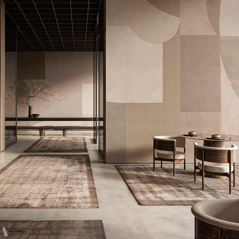 Het Luserna behang kenmerkt zich door een verfijnde compositie van organische en geometrische vormen die samen een rustig, architectonisch geheel vormen. Zachte rondingen van cirkels en halve manen wisselen zich af met rechthoekige vlakken, waarbij elke vorm een eigen textuur lijkt te dragen. De kleurwereld varieert van warme beige en taupes tot zachtere zanderige nuances, verrijkt met subtiele horizontale lijnen die aan geweven textiel doen denken. Dit abstracte samenspel creëert een eigentijdse, bijna sculpturale sfeer die zowel rustgevend als visueel intrigerend is.