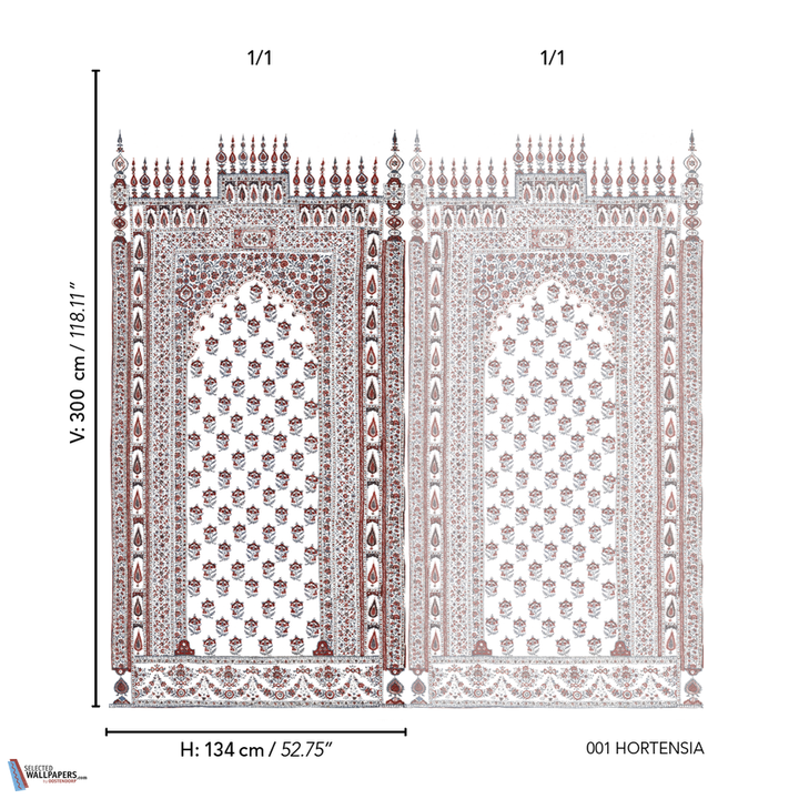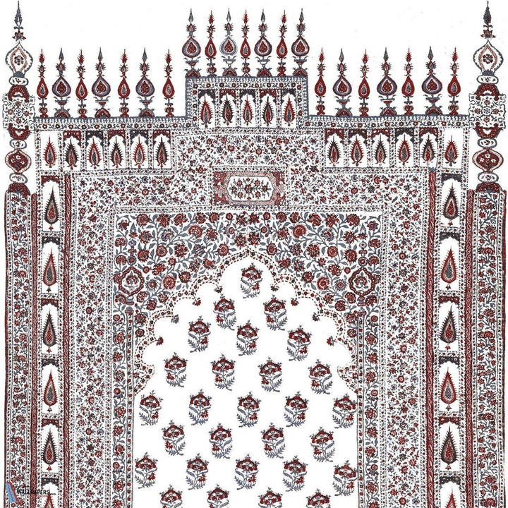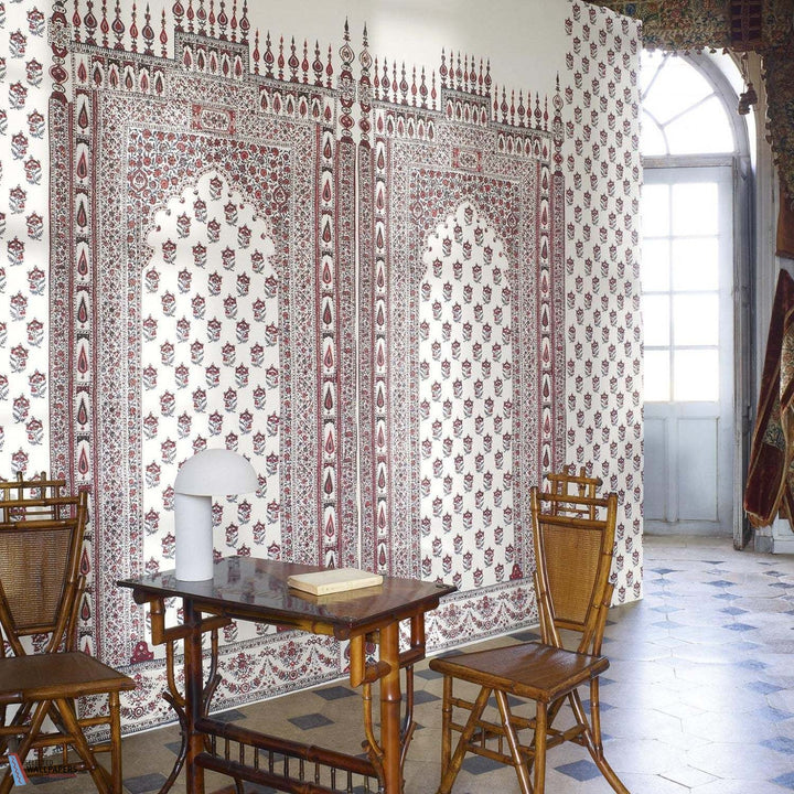 Mandalay behang Braquenie. Dit behang toont een Indiaas gebedsleed uit begin 19e eeuw. Het ontwerp heeft een mihrab motief met bloemranden. Gedrukt op linnen. Behang Mandalay Braquenie by Pierre Frey Collection Anniversaire 1823.