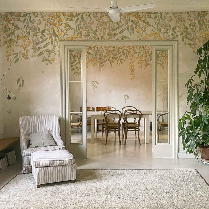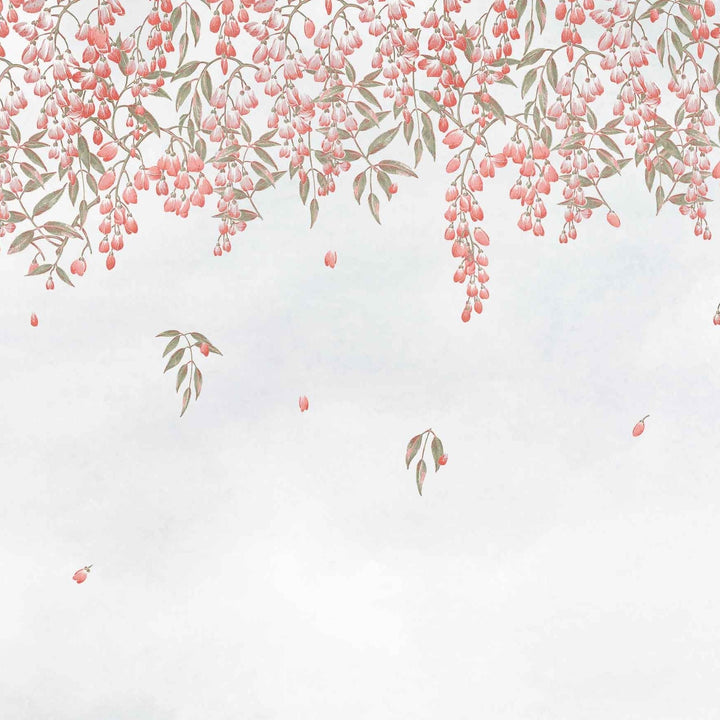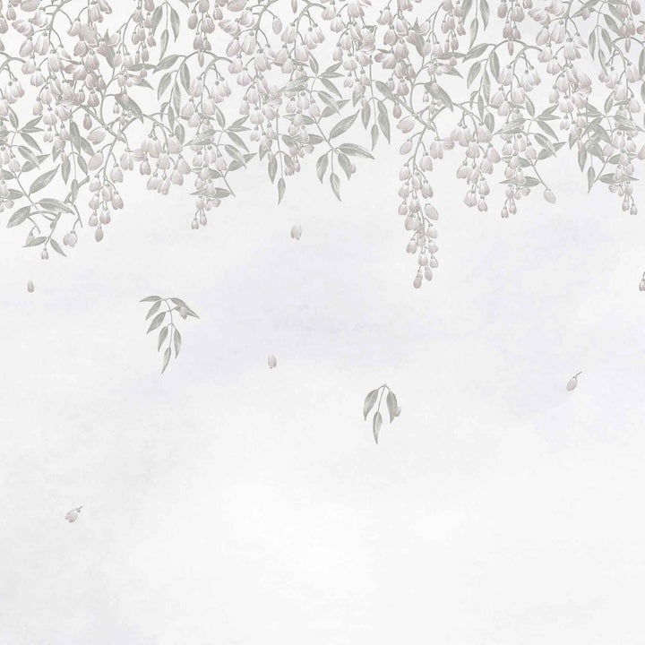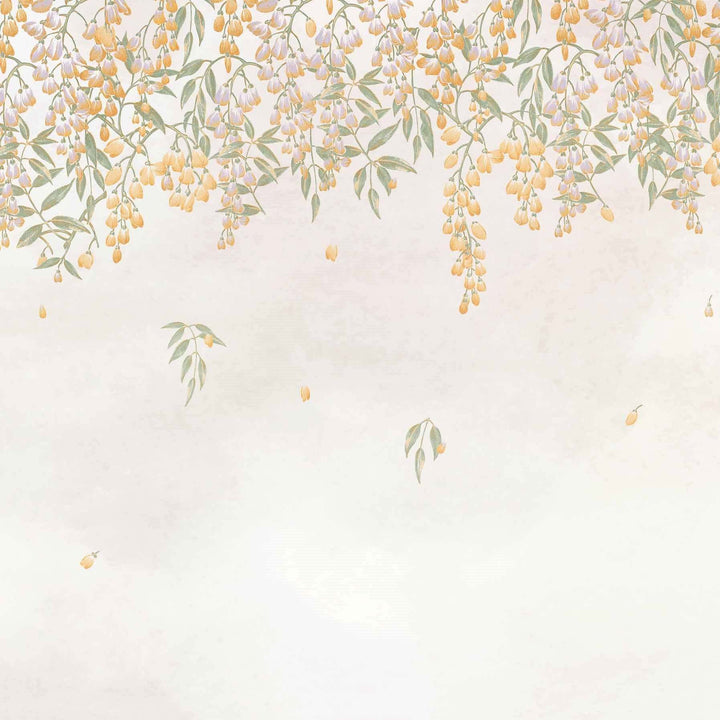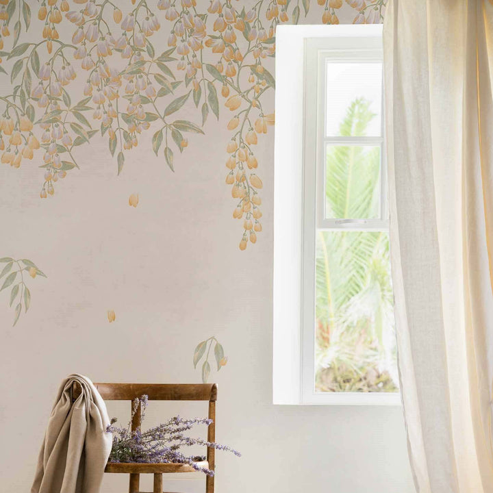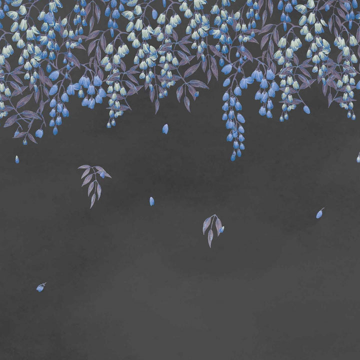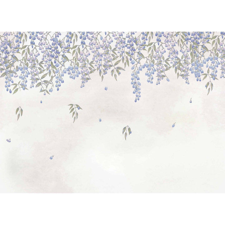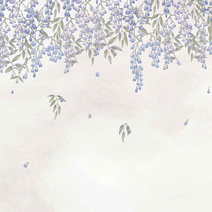 Manuela behang Coordonne. Dit behang een bloemenparadijs van hangende blauwregens. Behang op maat dat gedrukt wordt op Non Woven, Vinyl, linnen of zijde materiaal. Behang Manuela Coordonne Aracne collectie.