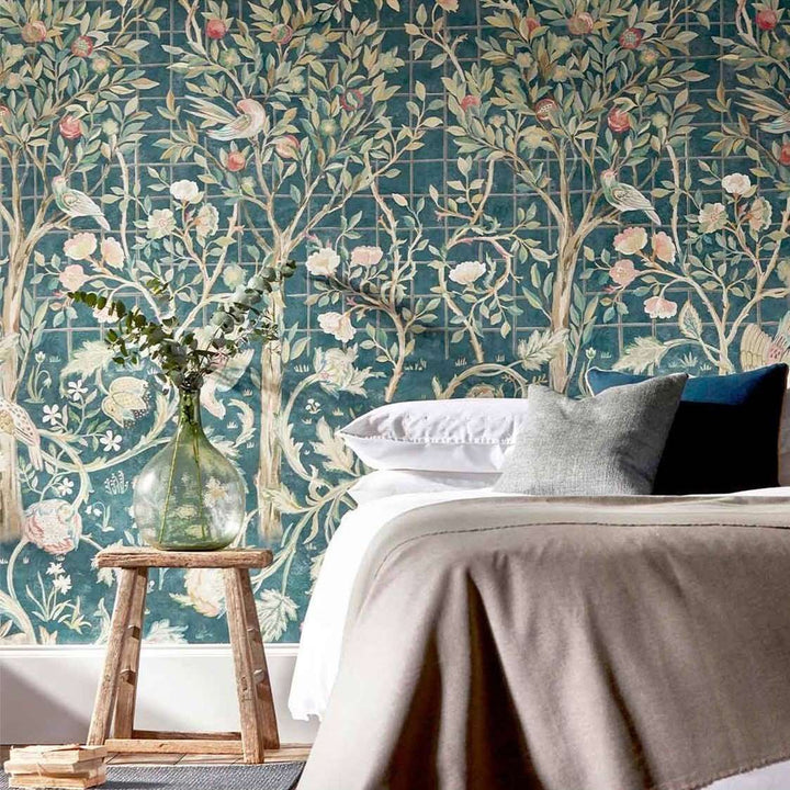 Melsetter behang van Morris & Co. Geïnspireerd door geborduurde bedhangingen, oorspronkelijk gemaakt door May Morris voor het bed van haar vader c.1893, toont deze nieuw getrokken behangversie het spectaculaire ontwerp van Mays van vogels en bloemkoppen achter een centrale fruitboom. Geproduceerd als een paneel van 3 meter. Melsetter van Morris & Co is een handgeschilderd fresco-stijl ontwerp met een gevoel in een tuinkamer.