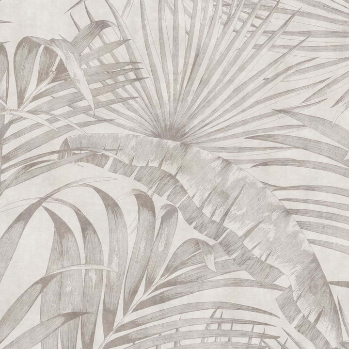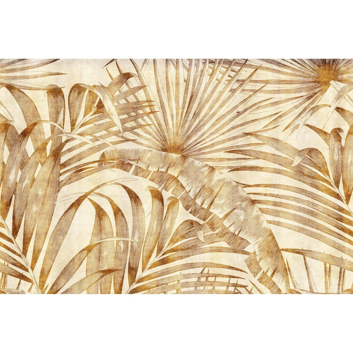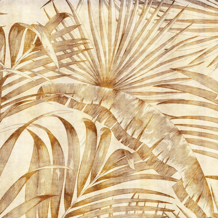 Meridiana behang van Glamora. Dit behang toont uitgestrekte palmbladeren. Een natuurlijke uitstraling is een goud / bruin tint die een prachtige luxe uitstraling achterlaat.