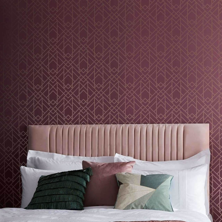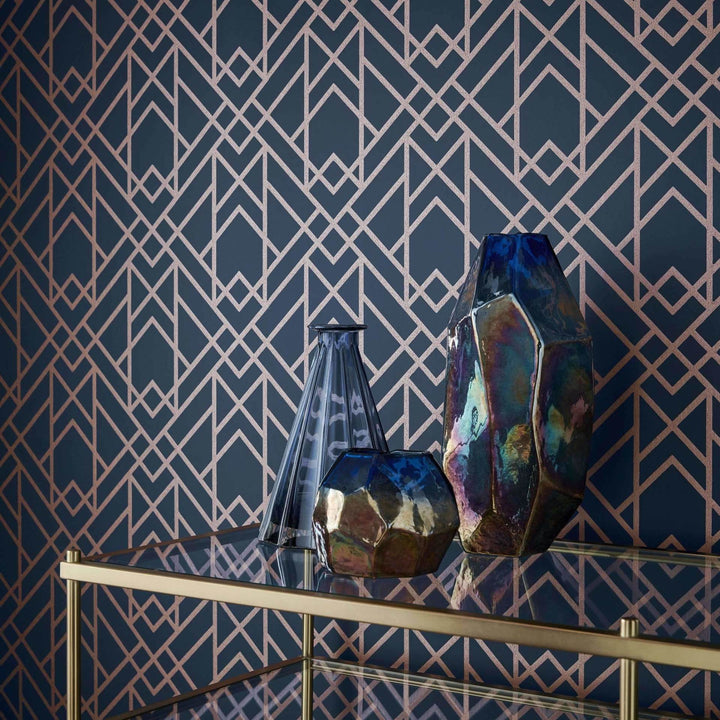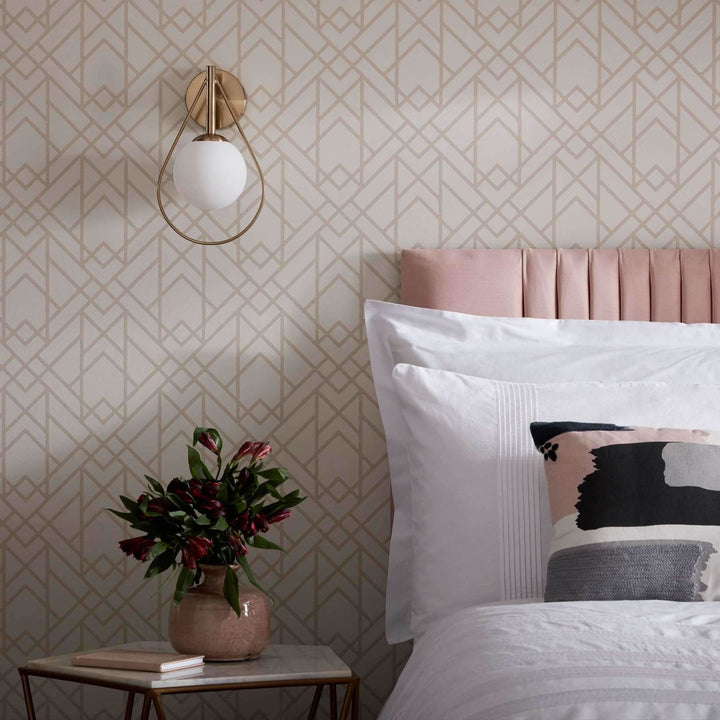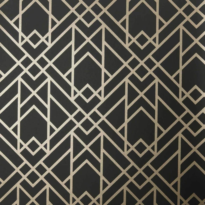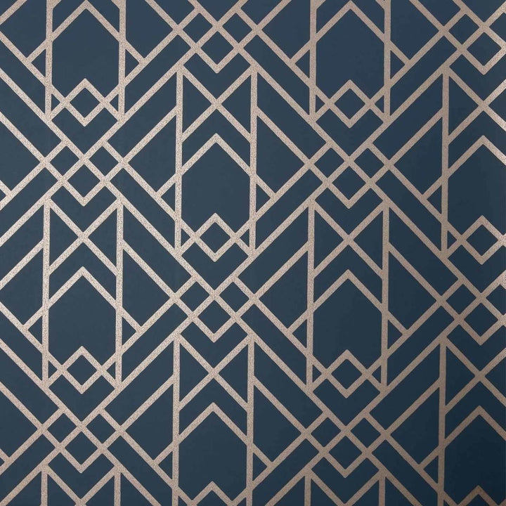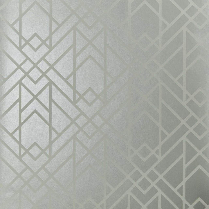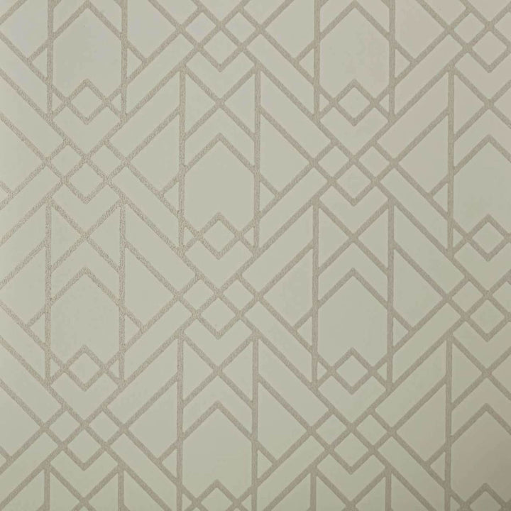 Metro behang van 1838 wallcoverings. Dit behang zit vol in elkaar grijpende symmetrische lijnen. Het creëert dit stijlvolle geometrische ontwerp, typisch voor de Art Deco-periode en perfect voor hedendaagse en klassieke woonruimtes.