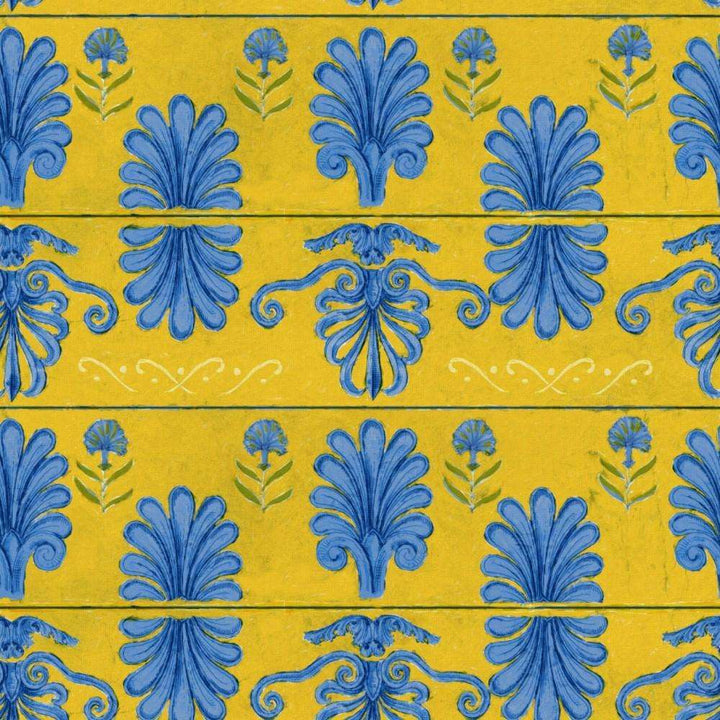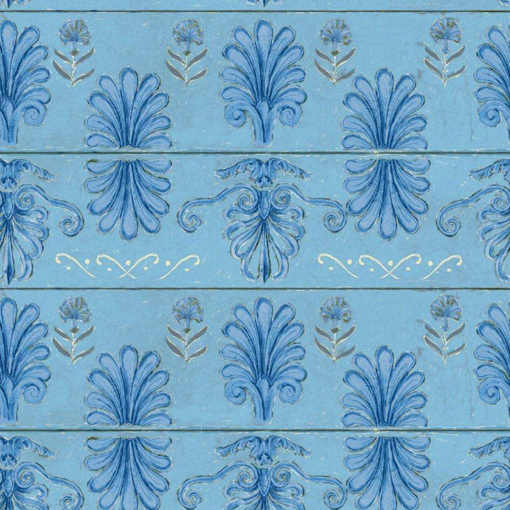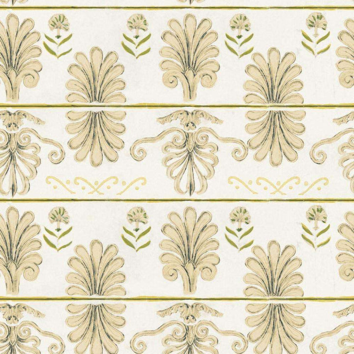 Mykonos Villa Motif behang van Mind the Gap. Dit behang zit vol fijn ornamenten met decoratieve algen die zorgen voor een fraai patroon. Voel de warmte van een warme zomerdag en hul je wanden in deze prachtige tinten.