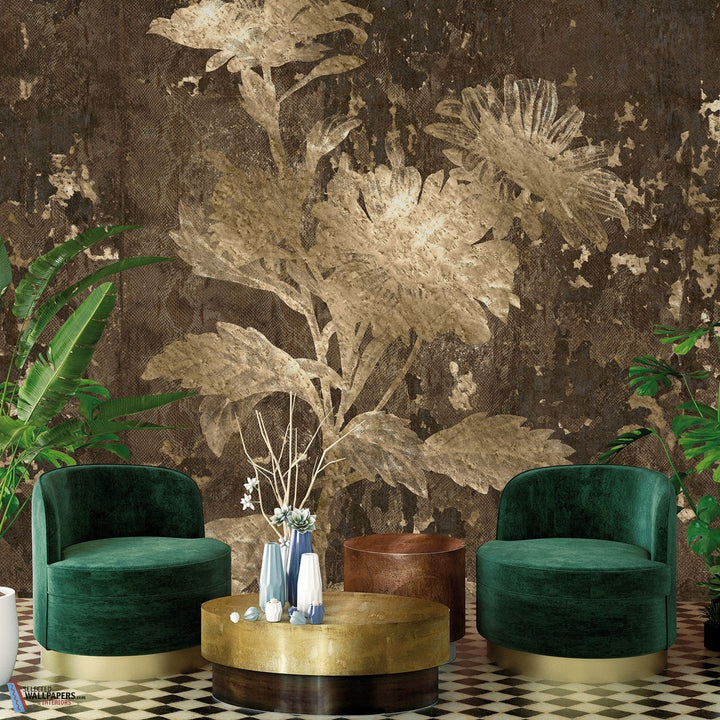 Mystic behang Muance. Dit behang op maat toont grote gouden bloemen. Geprint op Metallic Gold geeft dit behang een luxe uitstraling. Behang Mystic Muance behangcollectie Edition 5 Lush.