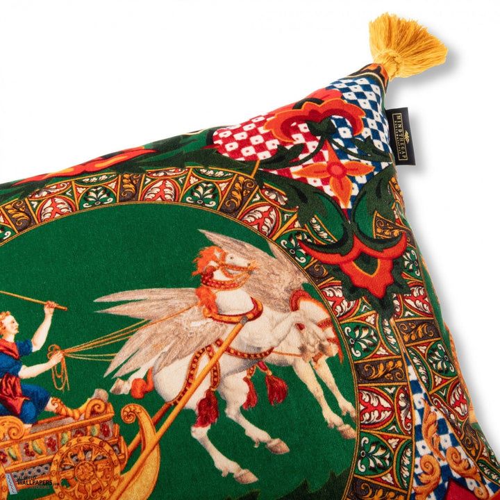 Mythology Velvet kussen Mind the Gap. Een kussen met majestueuze koetsen en koninklijke paarden. Een tafereel dat doet denken aan de grootsheid van het gouden tijdperk van het Romeinse Rijk. Kussen Mythology Velvet Mind the Gap.