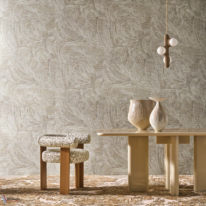 Nastro behang Casamance. Dit behang van textiel toont sierlijke bewegingen van een lint. Het illustreert licht en schaduw van Italiaanse meesterschilders. Een matte en gesatineerde afwerking gemaakt met behulp van drie garens. Behang Nastro Casamance Palatino behangcollectie.
