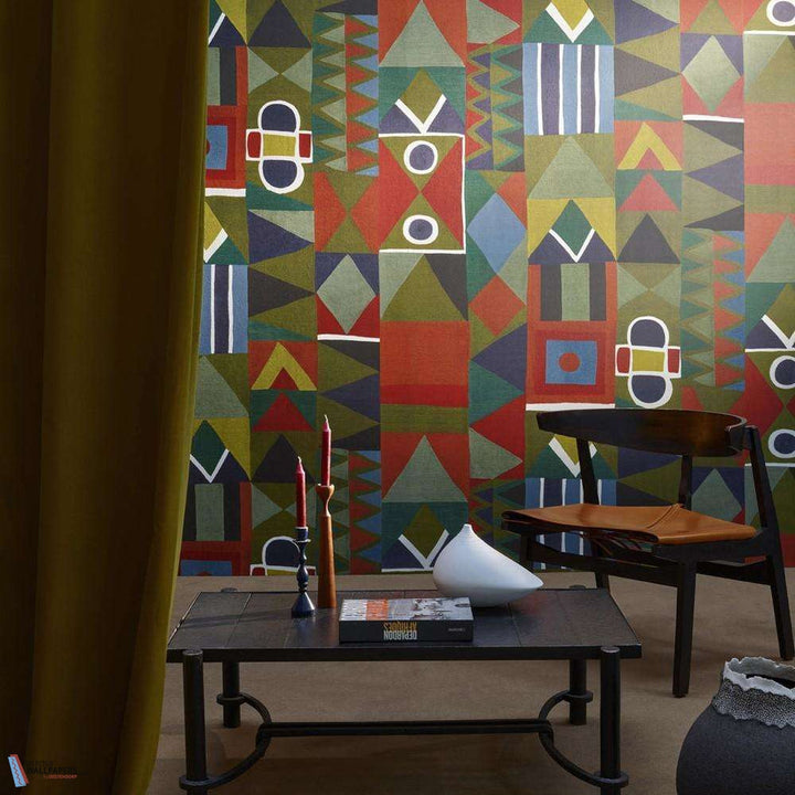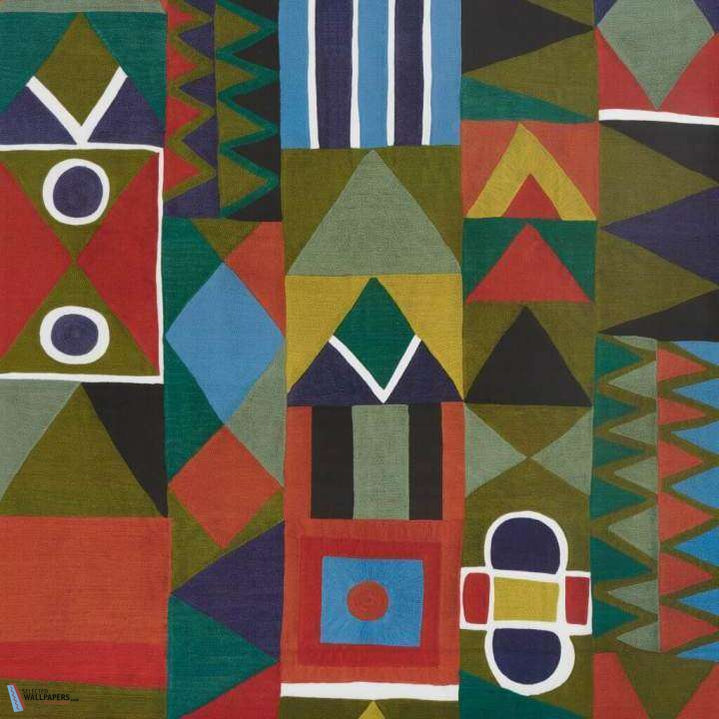 Ndebeles behang van Pierre Frey. Dit behang is een eerbetoon aan de kunst van N'débélés-vrouwen. Het gedrukte behang van N'débélés weerspiegelt de volledig geborduurde linnen stof en toont de kracht van grafische kunst.