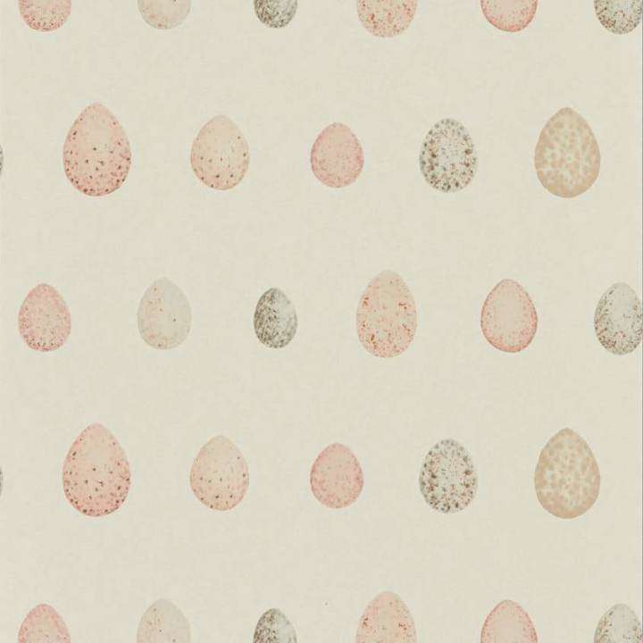 Charmante gevlekte eieren van roodborstjes, boomzwaluwen, merels en kruisbekken nestelen samen in een neutraal palet en werden oorspronkelijk in waterverf geschilderd voor dit behangontwerp.