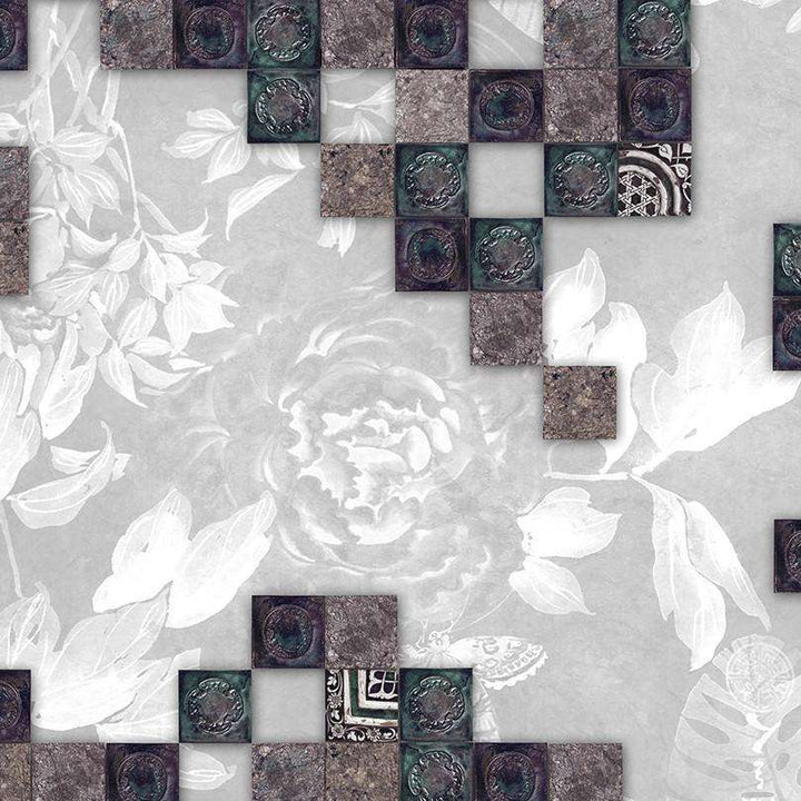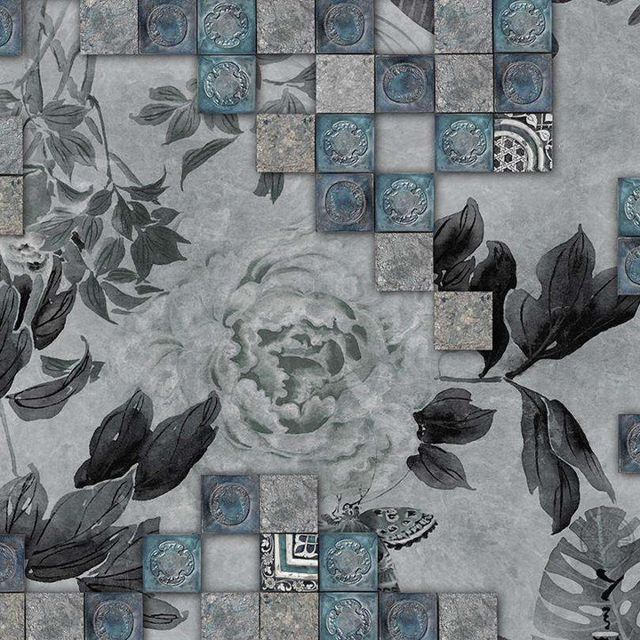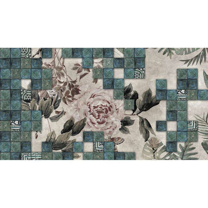 October Rain behang op maat van Muance. Dit behang springt eruit door de sprekende roos. Aangekleed met bladeren en tegeltjes wordt er een diepte gecreëerd.