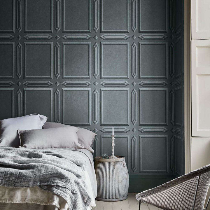 Elk afzonderlijk paneel binnen dit behangontwerp bevatte oorspronkelijk een overdadige voorstelling; een weerspiegeling van de vindplaats in Bloomsbury, een rijk gebied met een sprekende geschiedenis. Door de overbodige details achterwege te laten, blijft er een ongepolijst, maar elegant trompe l’oeil houtpaneeleffect over, dat op traditionele wijze kan worden aangebracht op alle wanden van een ruimte of, voor een tijdlozer en strakker effect, op een enkele wand in een moderner interieur.
