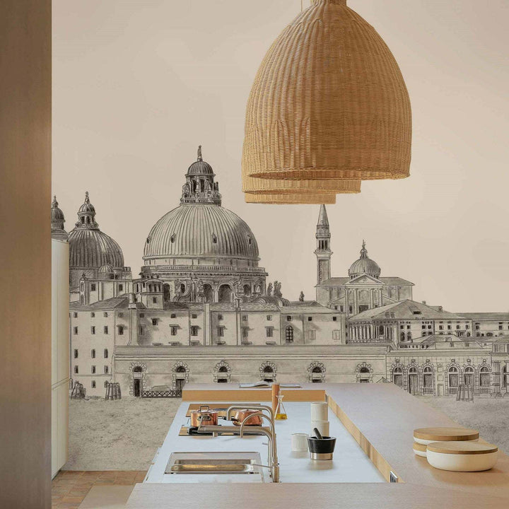 Olympus Textile behang Coordonne. Dit behang toont het huis van de goden, een prachtig staaltje architectuur. Textiel behang op maat dat gedrukt wordt op linnen of zijde materiaal. Behang Olympus Textile Coordonne Aracne collectie.