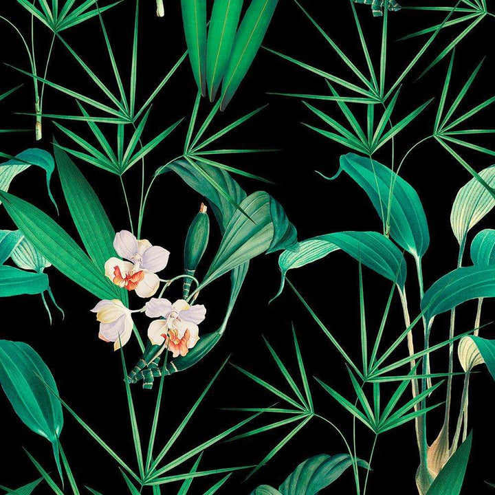 Palm Springs behang van Mind the Gap. Dit behang heeft een weelderig arrangement van tropisch gebladerte, op een donkere achtergrond, geinspireerd op de exotische tuinen in Palm Spring.